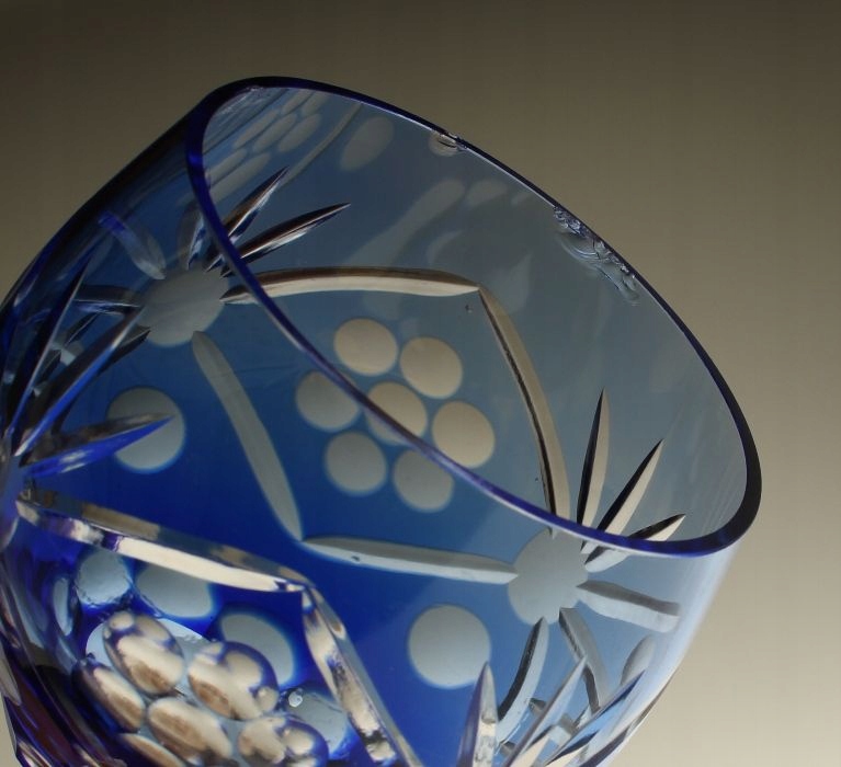 Пять высоких стаканов из хрустального стекла, так называемого ремерс. Полированные чаши, окрашенные методом лессировки в следующие цвета: кобальтовый (две), оранжевый (две) и баклажановый (один). Бесцветные ноги. Очки родом из Чехословакии, вторая половина. XX век