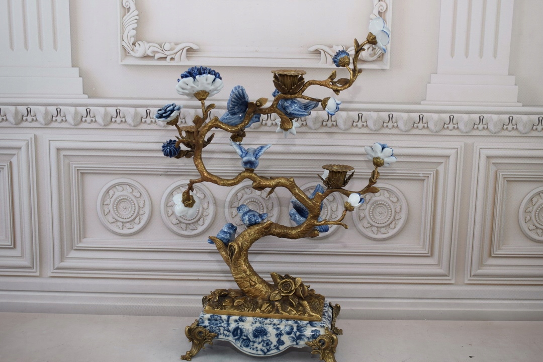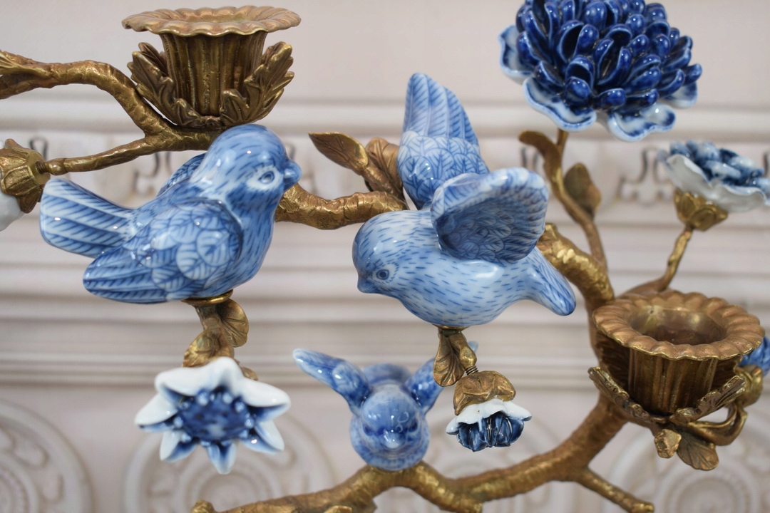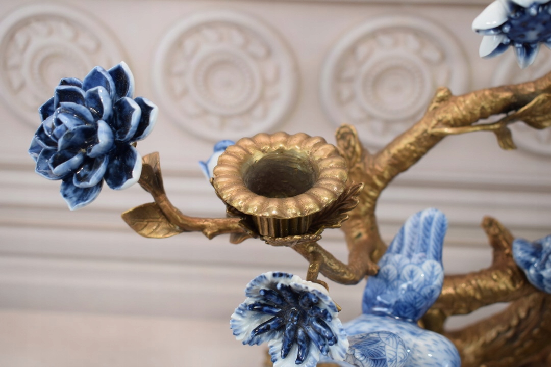 Бронзовый подсвечник + фарфор - птицы на ветвях - цветы - украшение