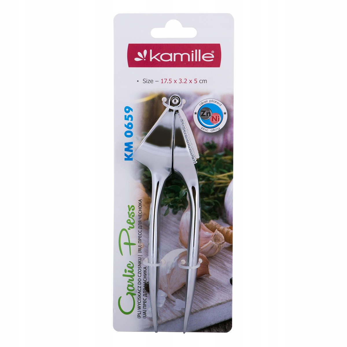 Чеснокодавилка Kamille изготовлена из высококачественного цинкового сплава. Дополнительно пресс оснащен зубчатым элементом, который позволяет одним движением удалить остатки, оставшиеся при прессовании чеснока.