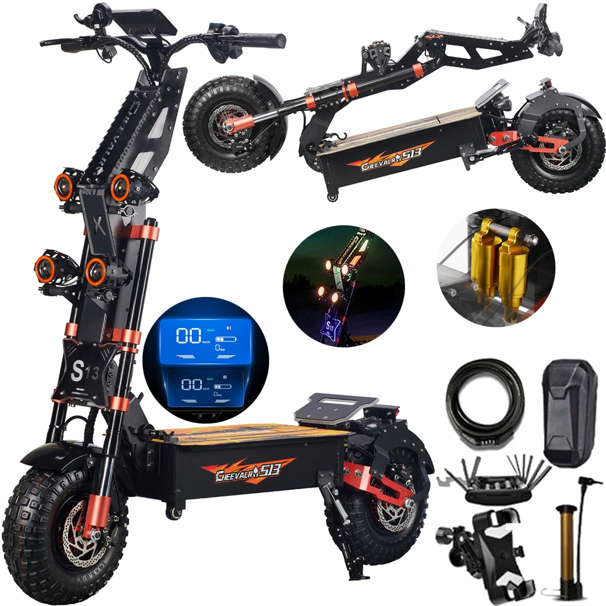 Особенности: Pięthable Tyres, цифровой дисплей, двойная тормозная система, заменяемые батареи, складывание