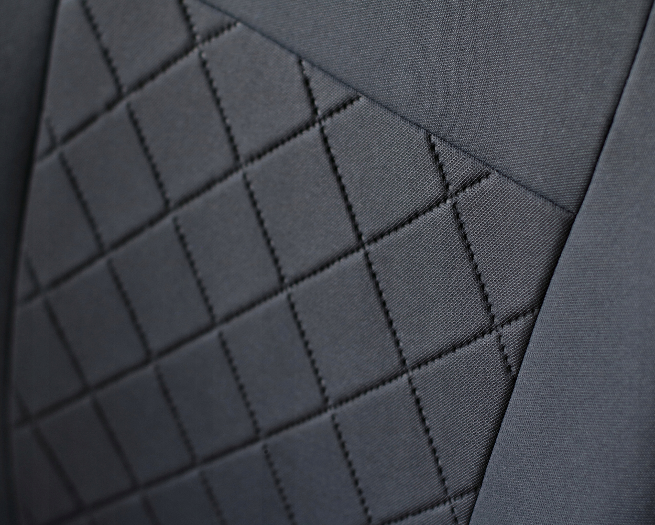 Чехлы на заказ DRAFT LINE выполнены из обивочной ткани пепельного цвета – новинкой в предложении является тисненая фактура материала в виде сеток, использованная на средней полосе. Плюсами этого типа ткани, помимо эстетических качеств, является также лучшая циркуляция воздуха, что повышает комфорт использования.