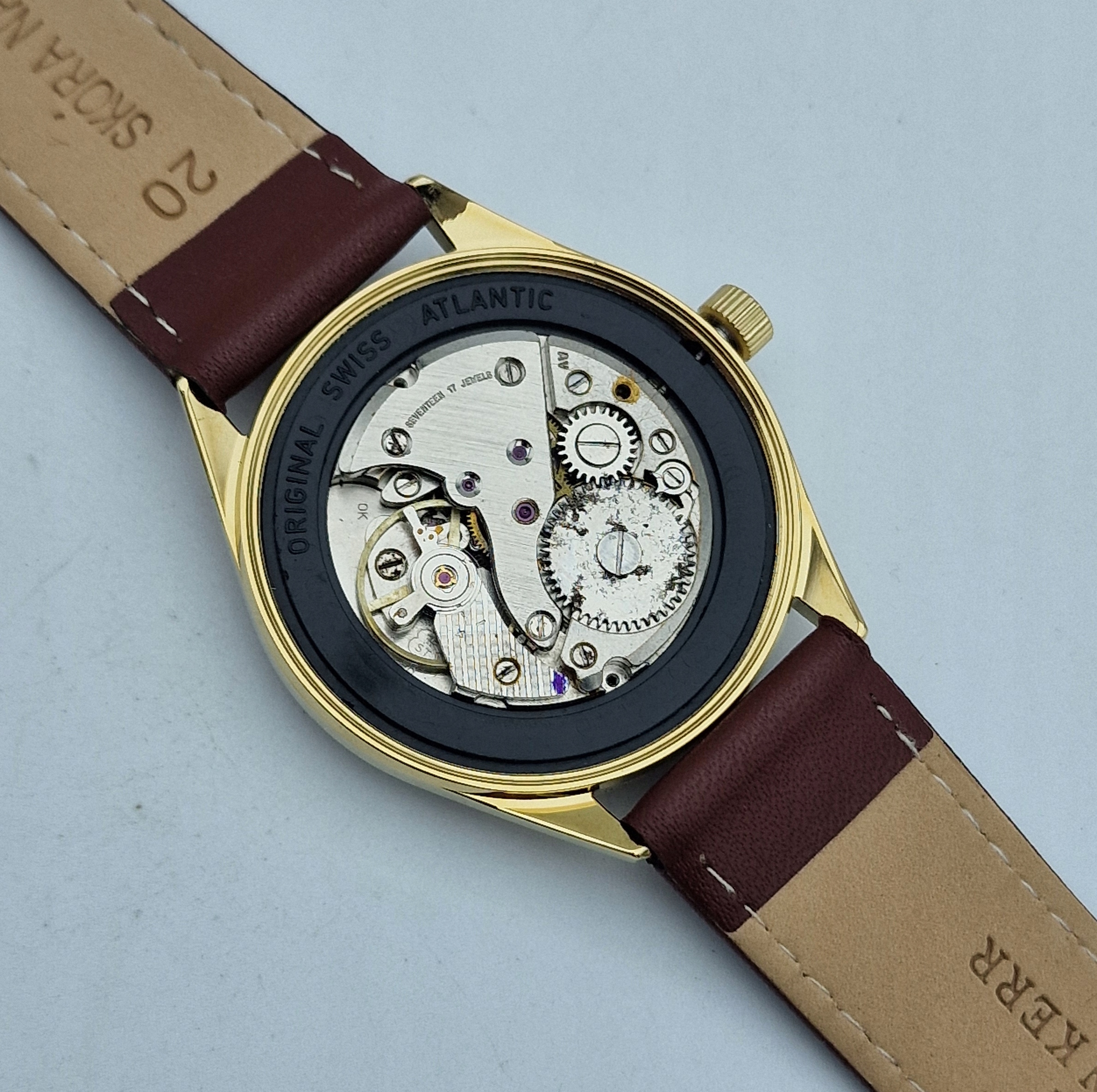 На этот раз я могу предложить сумасшедшие часы для ценителей и очарований. Это классическая модель Atlantic Worldmaster Original Morcemaster Уникальный для знатока !!! - Механизм наблюдения на 17 камнях, со швейцарской якорькой. Что касается механизма, подписи были нарушены: « 17 драгоценности, швейцарские изготовления ». Механизм находится на хорошей и точной походке после обзора и технического обслуживания в The Watchmaker, в отличном состоянии. - позолоченный конверт. Задняя крышка выключена, на нем есть подписи: «Задняя часть из нержавеющей стали, водонепроницаемая, инфока, антимагнитная, нерушимая, махадпинг, атлантический оригинал, 61476