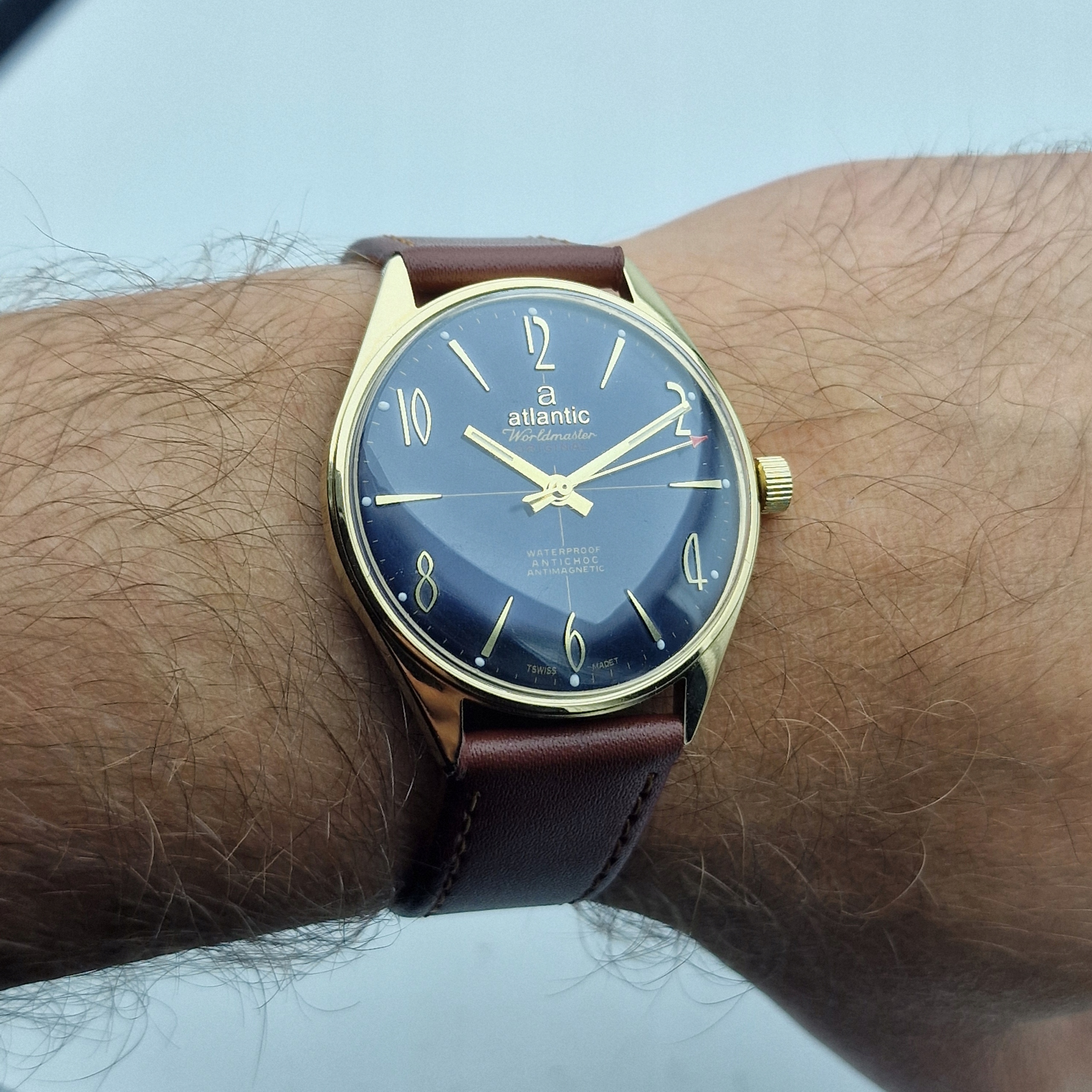 - темно-синий металлический диск с золотыми тегами. Оригинальный щит, подписанный: « Atlantic Worldmaster, Original, Antimagnetic, Antichoc, водонепроницаемый, швейцарский, изготовленный ». Щит в идеальном, не снимая, какой.