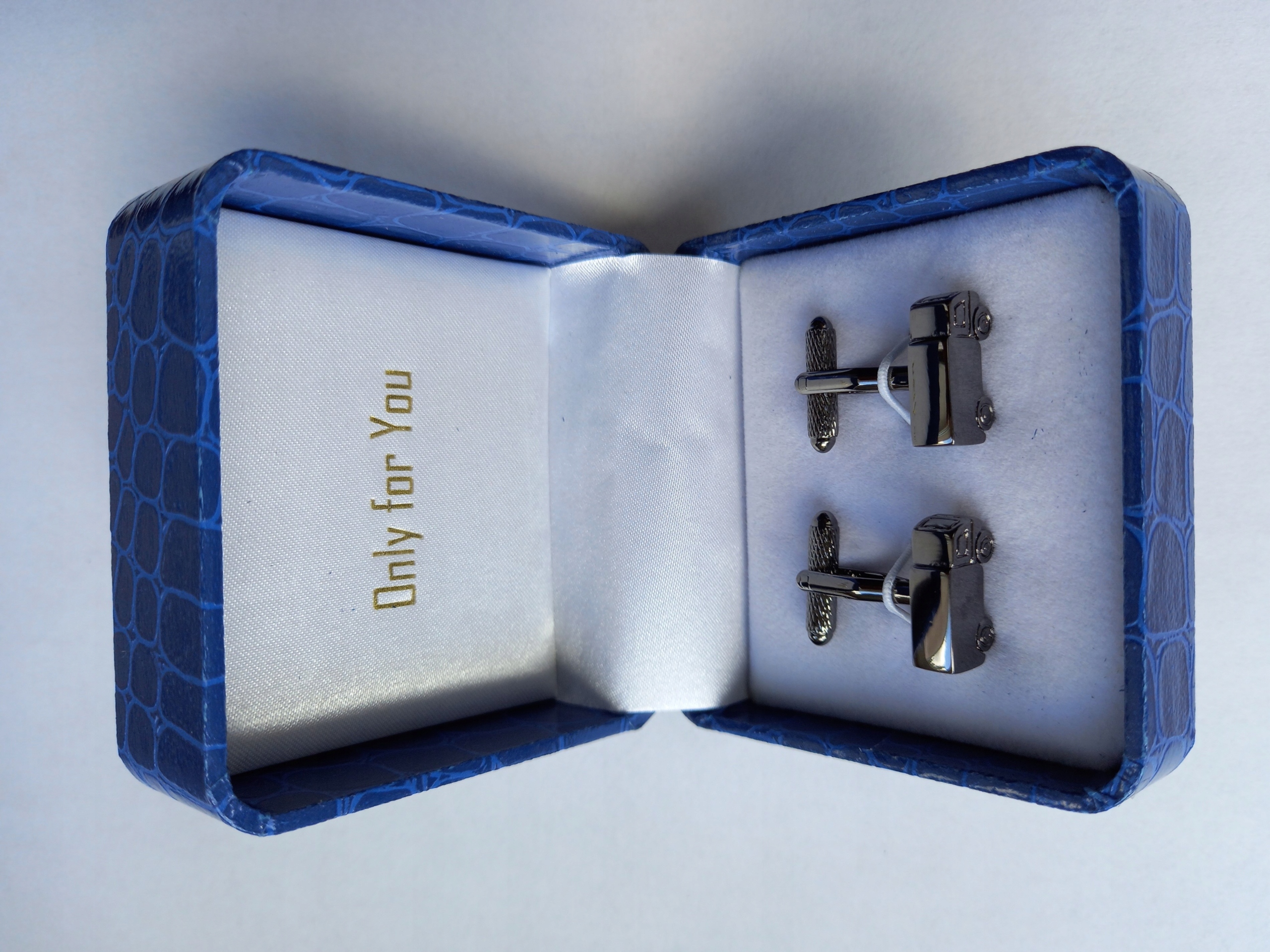 - Запонки были сделаны полностью из металла, покрытыми гальванически прочным, нерешительным титановым слоем драгоценного металла. Коробка, посвященная им с размерами ок. 8 x 8 x 4 см