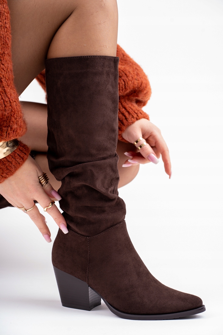 Човникові жіночі замшеві чоботи шоколадного кольору на підборах