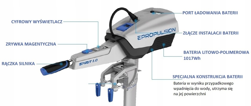 Двигатель является одним из наиболее важных компонентов системы привода. Spirit 1.0 использует высококачественный бесщеточный двигатель с водяным охлаждением. Он устроен аналогично коробке передач, что исключает сильный шум и не требует обслуживания. Если винт остановится или затормозит, столкнувшись с препятствием, встроенная защита отключит двигатель или полностью затормозит его. ePropulsion оснащен двухлопастным гребным винтом с крутящим моментом 1200 об/мин.