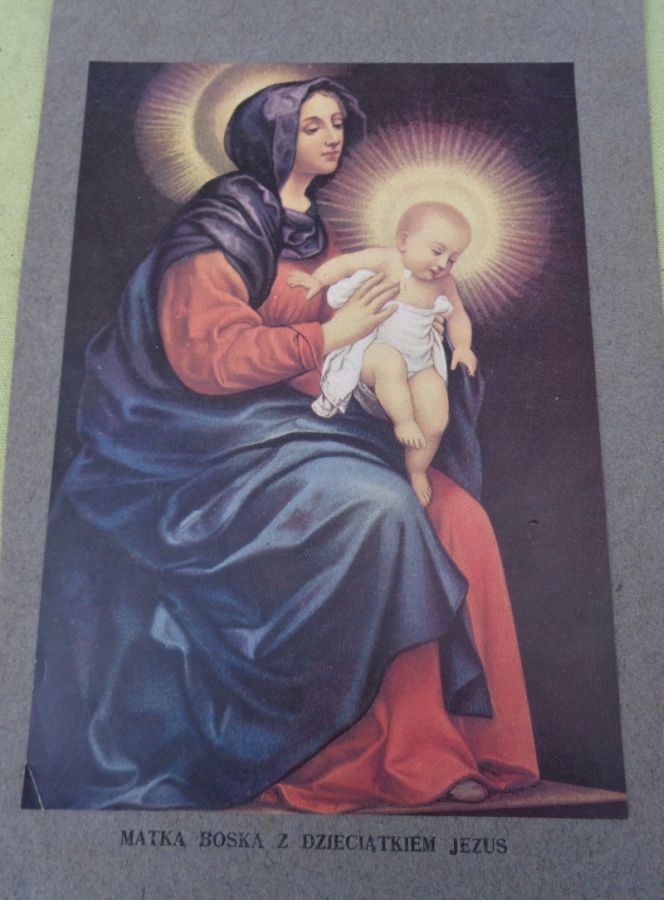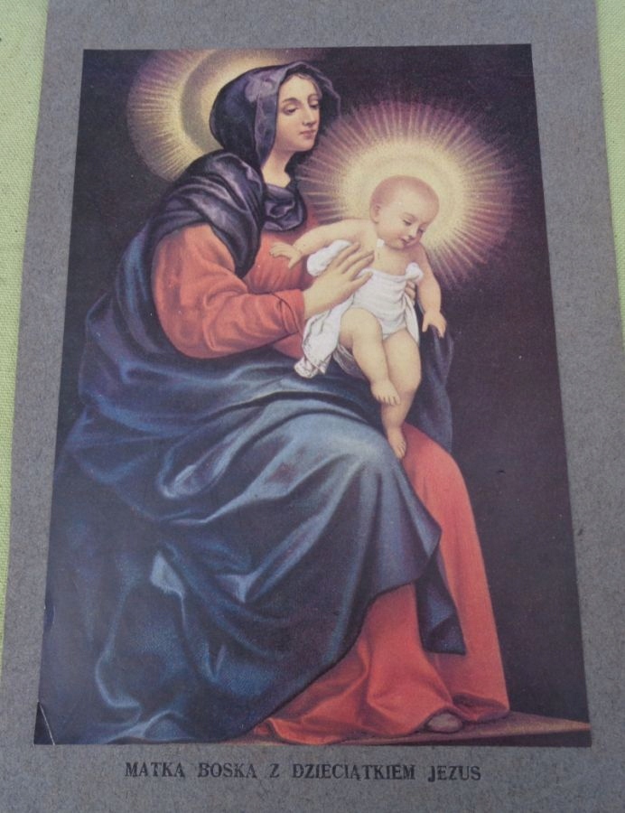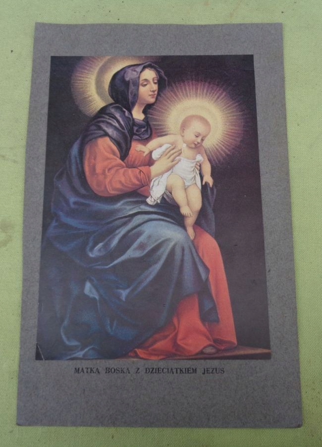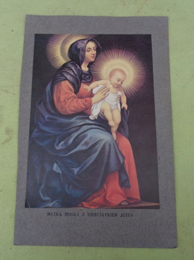 интересная, интересная красочная литография на священные темы 1900-1920. Мать Божья и ребенок Иисус были увековечены на литографии. Выставка была очень точно и тщательно сделана. Фон черный. Мадеры Божьей матери и Иисуса были сделаны в красивых цветах. Литография была помещена на сильную, жесткую бумажную основу. На литографии Pod есть надпись, которая была представлена в литографии. Я рекомендую эту интересную экспозицию для всех