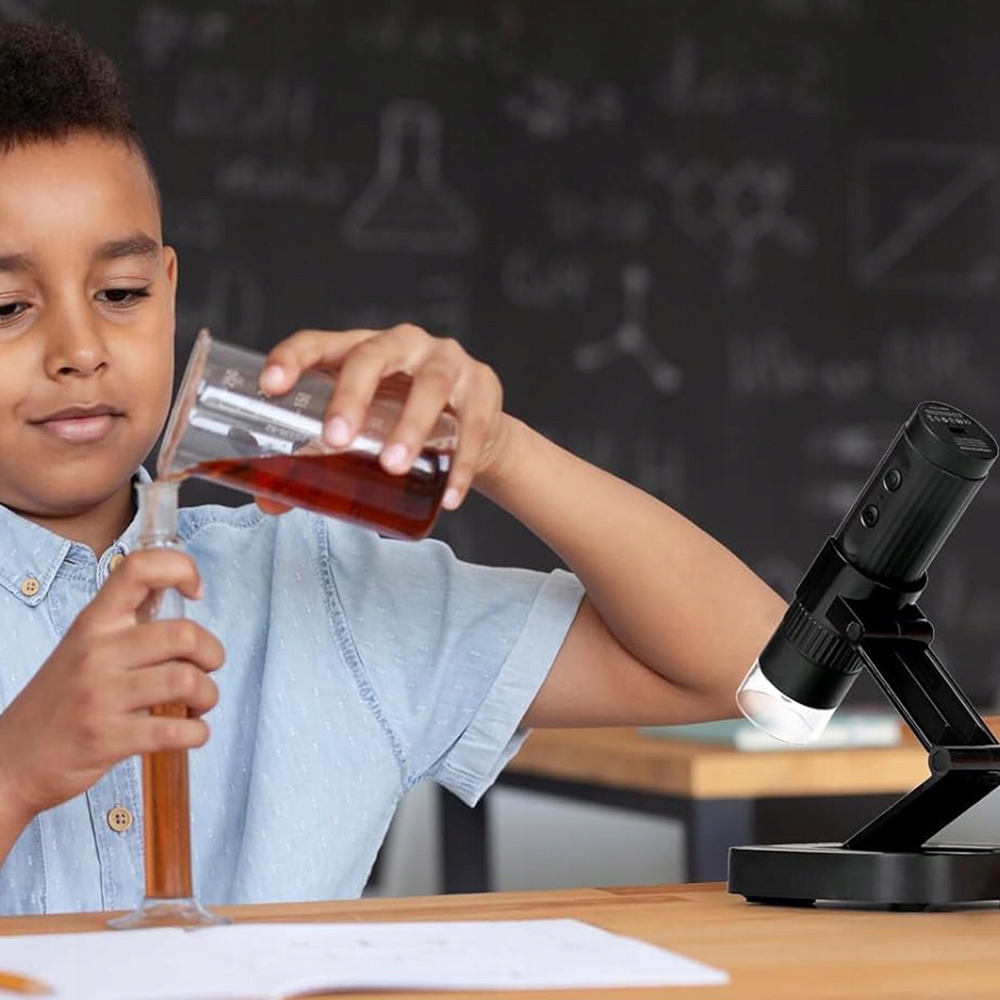 Цифровой микроскоп имеет складную подставку, позволяющую гибко регулировать угол и высоту. Мягкое основание обеспечивает устойчивое положение. Микроскоп весит всего 0,41 кг, легкий и компактный, поэтому его легко переносить. Оснащенный аккумулятором емкостью 700 мАч, он идеально подходит для мобильной работы, в том числе в полевых условиях.