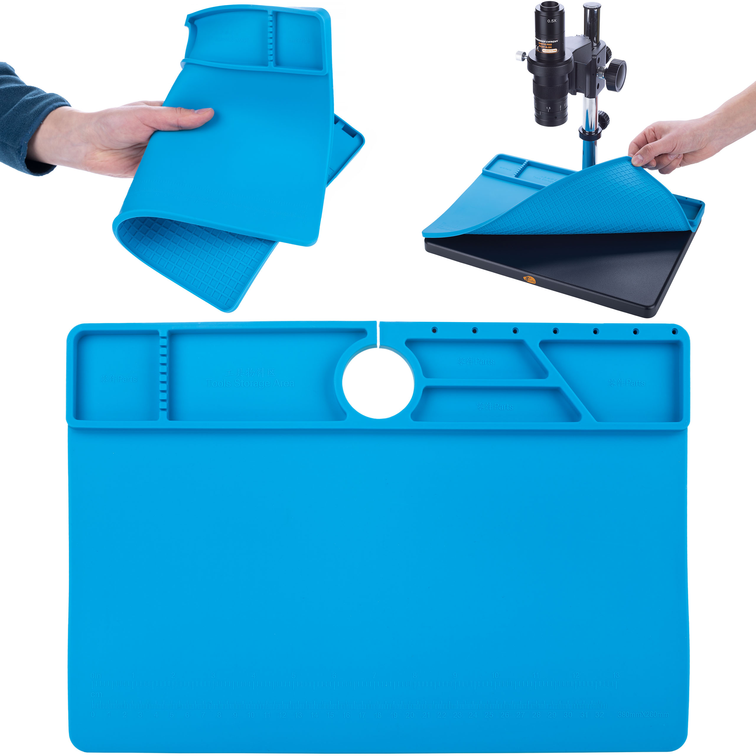 Силиконовый коврик с цифровым микроскопом 380x260 мм очень устойчив к температуре до 500 ° C, антистатическим и прочным, обеспечивая быструю установку «щелчок и воспроизведение», большое рабочее пространство и комфорт работы благодаря мягкой текстуре и сильной адгезии. Кроме того, он является водонепроницаемым, устойчивым к маслам и термически изоляции, обеспечивая безопасные условия труда.