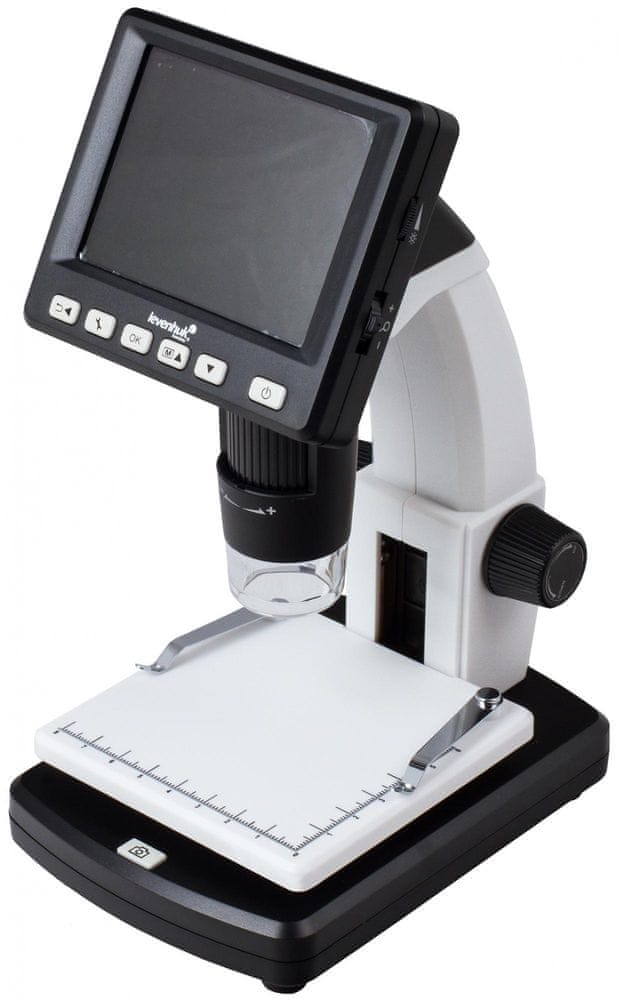 Цифровой микроскоп Levenhuk DTX 500 LCD обеспечивает увеличение изображения от 20-кратного до 500-кратного. Он оснащен цветным ЖК-дисплеем с диагональю 3,5 дюйма и цифровой камерой с разрешением 5 Мп. Имеет встроенную подсветку, состоящую из 8 светодиодов с регулировкой яркости, позволяющую установить нужный уровень подсветки, а также шкалу измерения (8 см по шкале). по оси X и 6 см по оси Y).