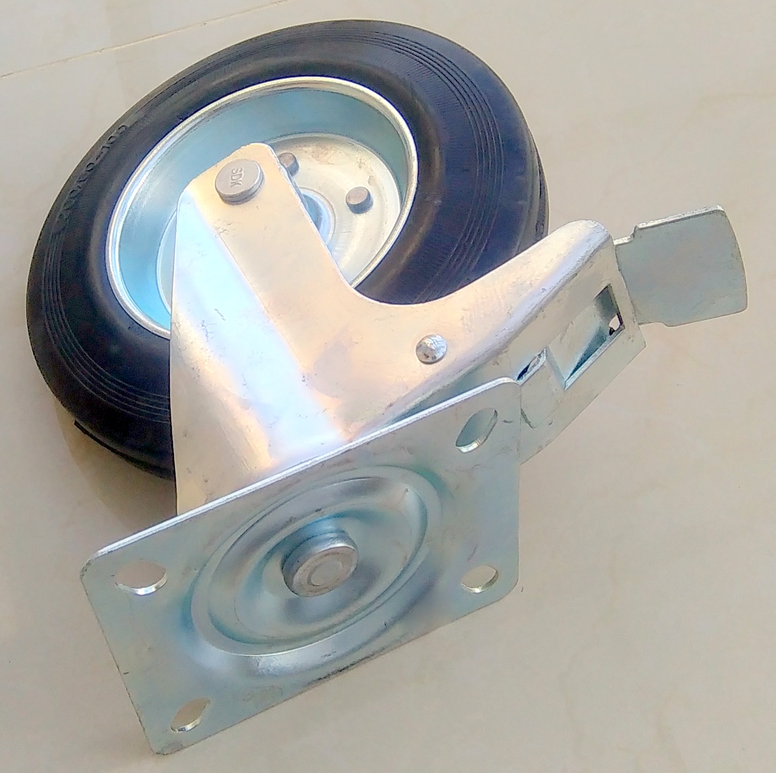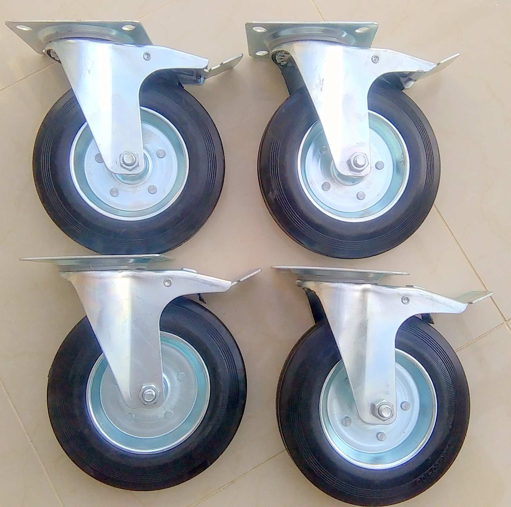 Колеса, прикрепленные к SO -SALLED Плитка представляет собой комбинацию вилки из прессованного стального листа и колеса со стальным узлом и полной черной резинкой. Голова кузницы удваивается и защищена от грязи специальным пылевым уплотнением. Все металлические элементы набора покрыты антикоррозивным хромическим покрытием