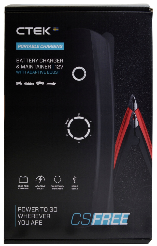 Ctek CS Free, первое в мире многофункциональное переносное зарядное устройство было награждено за революционную адаптивную технологию повышения, которая позволяет вам запускать автомобиль из разряженной батареи за 15 минут, а также способность пополнить небольшую используемую автомобиль, хранящийся вдали от сети электроэнергии, и пролезного введения аксессуаров, обеспечивающих акции за пределами сети.