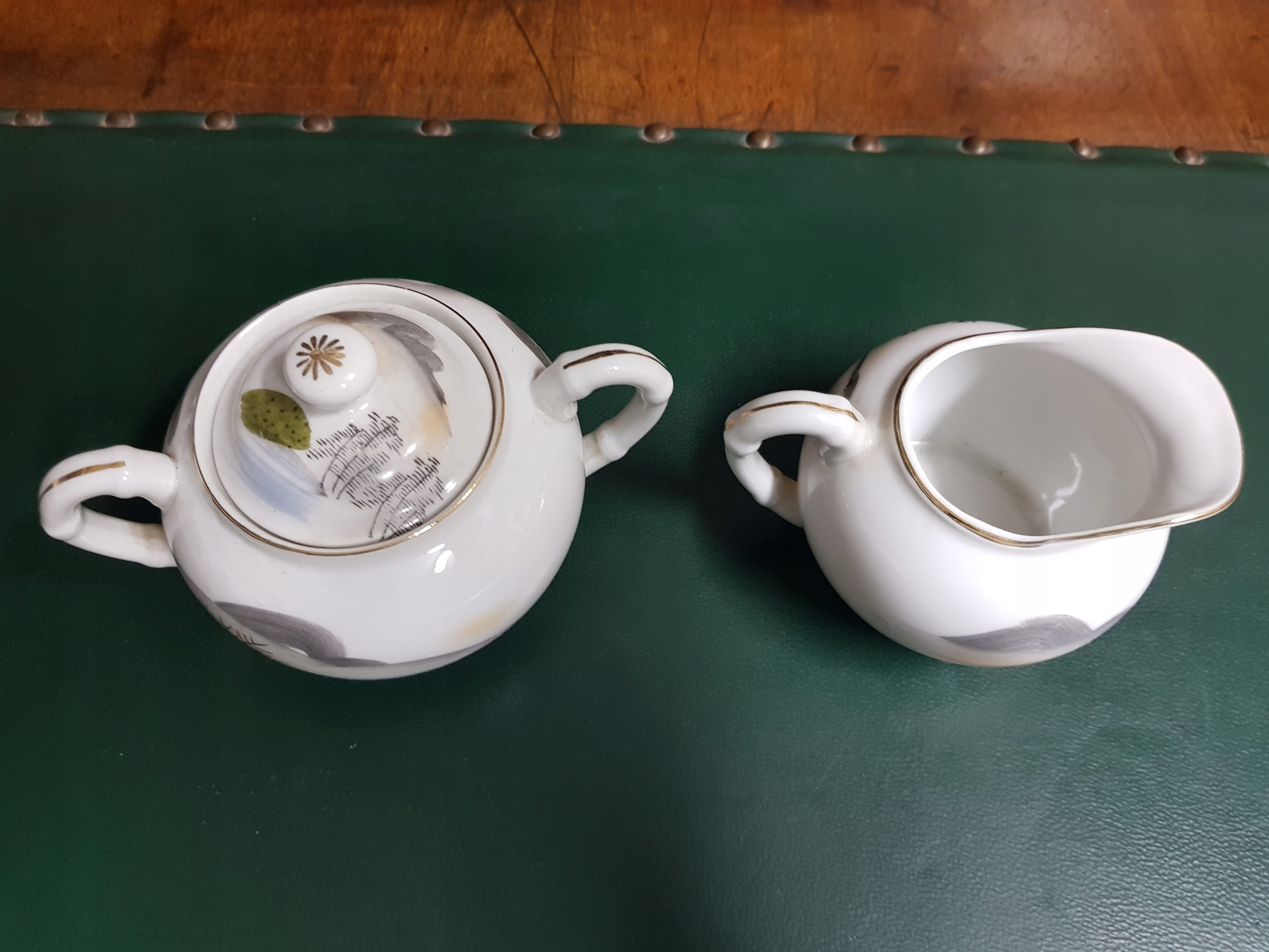 Предмет аукциона — японская сахарница и молочник.Мельничный мотив? Ручная роспись.