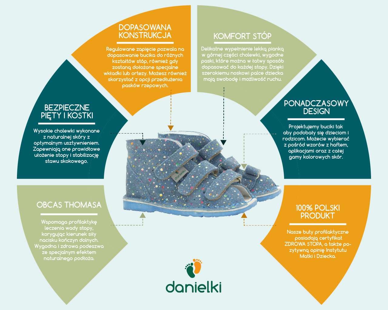 Следует помнить, что профилактическая обувь – это то, что лучше всего предоставить вашему ребенку с самого начала его прогулки. Помимо использования лучших материалов, наша обувь шьется и отделывается вручную лучшими специалистами, что дополнительно влияет на функциональность и приятный внешний вид обуви Danielek, предлагаемой в нашем магазине. Одним из наиболее важных аспектов, влияющих на эффективность нашей профилактической обуви, является то, что ее дизайн был создан специалистами на основе рекомендаций ортопедов и физиотерапевтов. Обувь Даниэльки Рож также очень прочная. Используя этот тип обуви