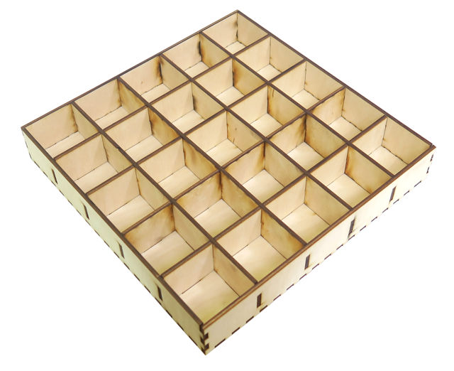 Ящик из фанеры толщиной 3 мм с 25 отделениями с внешней размеры: 21,8x21,8x3,5см.