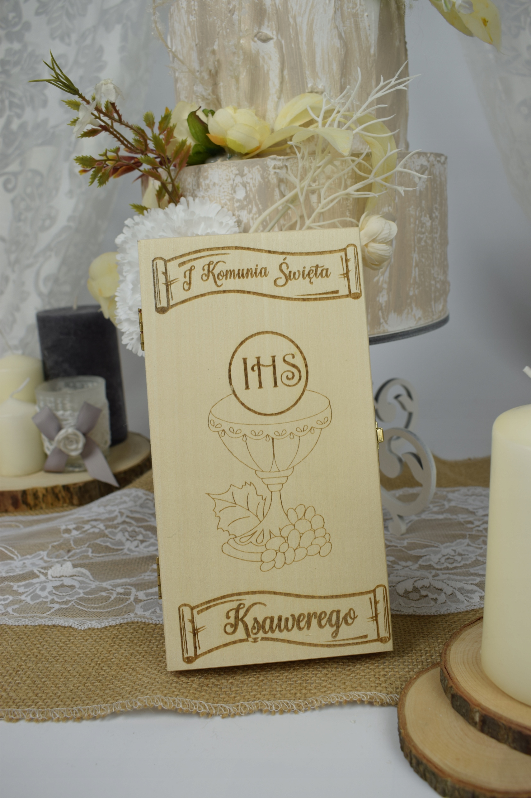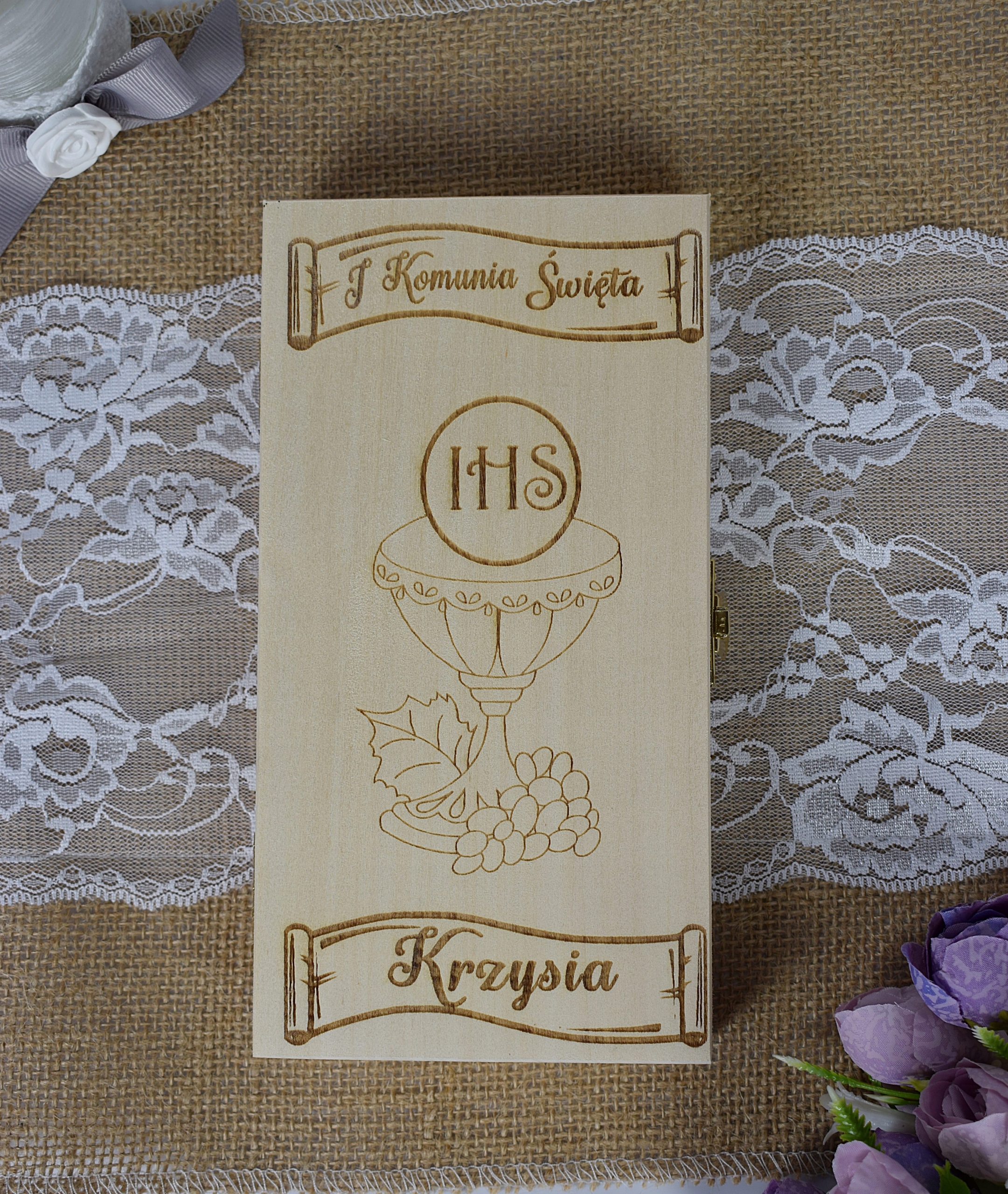 Деревянная шкатулка с именной гравировкой станет прекрасным сувениром на причастие и еще одной формой денежного подарка/подарка.