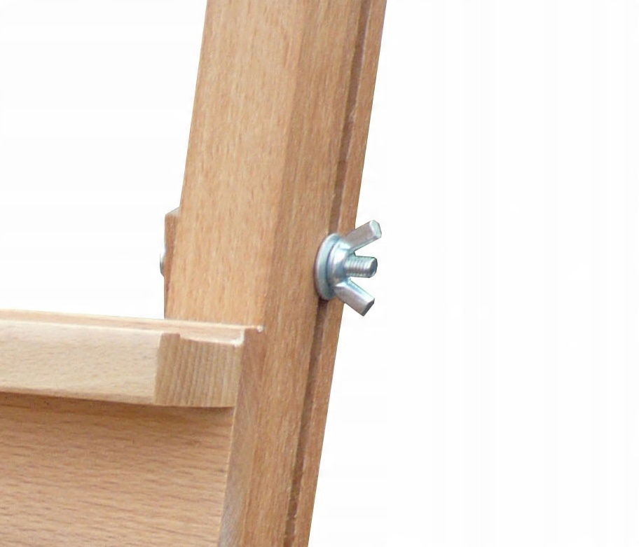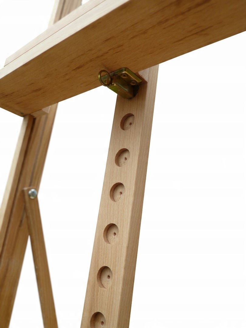 Точная регулировка высоты посредством системы отверстий на планке с металлическим замком и регулируемого угла мольберта обеспечивают оптимальную и стабильную поддержку холста или рамы картины.