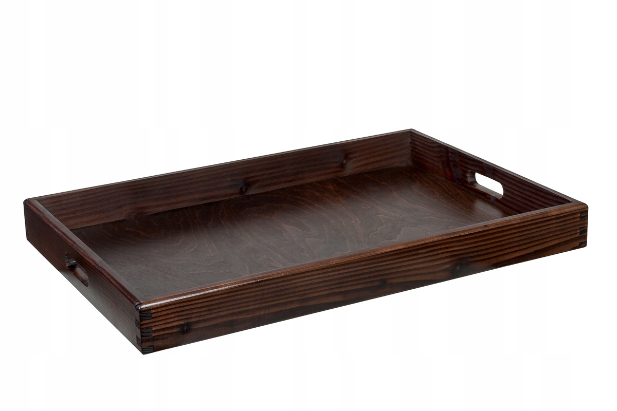 Большой деревянный поднос, окрашенный в венге; темно-коричневый с темно-бордовыми краями.