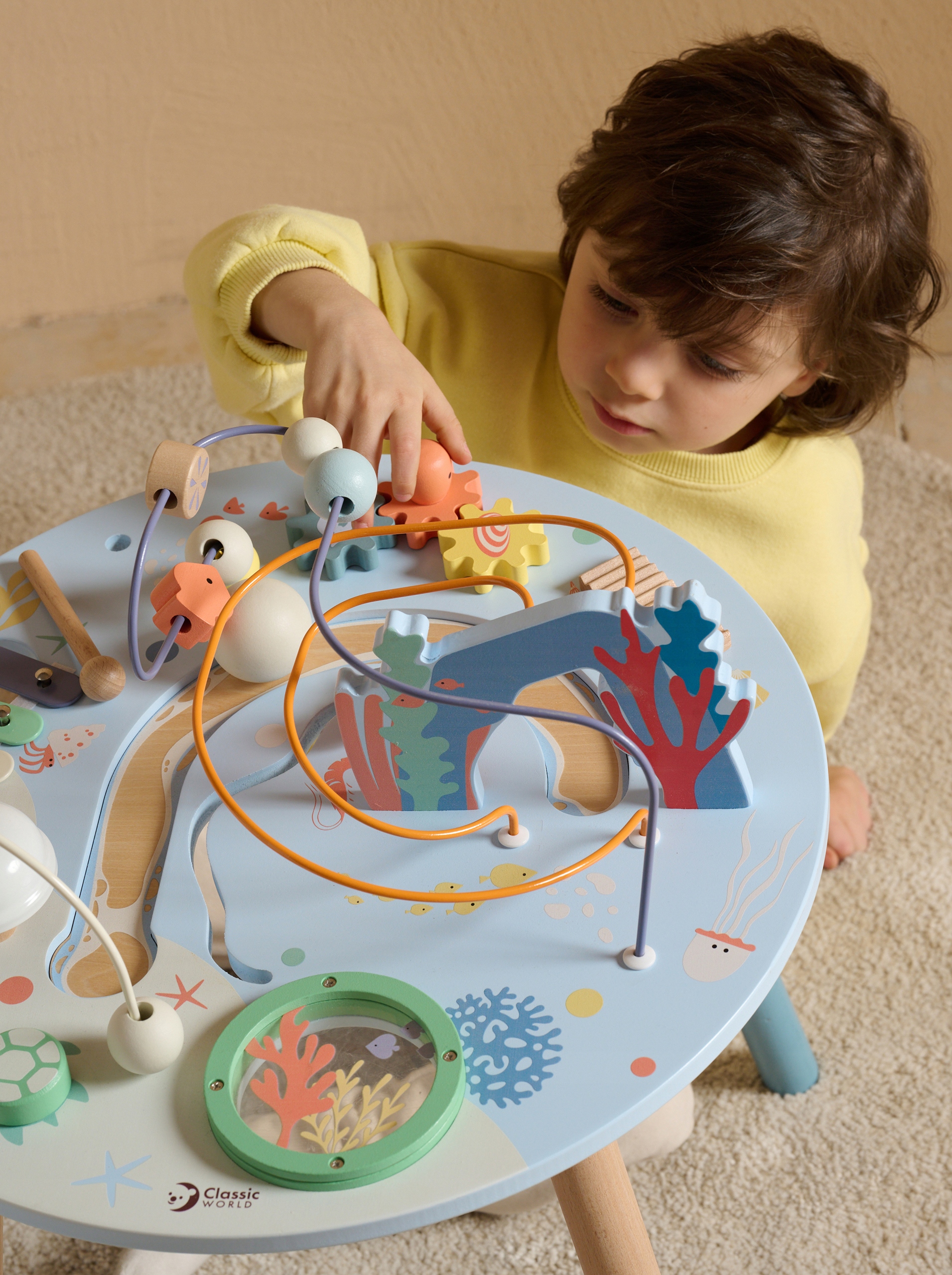 Классический мировой деревянный стол Полный красочных достопримечательностей, таких как моторная петля, шестерни, тарелки и барабан, принесут большую радость и, кстати, помогут развить важные навыки, такие как ручные навыки, логическое мышление и ловкость. Стол поощряет детей играть в отставку и является отличным знакомством с миром форм и цветов. Сделанный из дерева и нарисованный безопасными красками, он полностью дружелюбен к самым молодым.