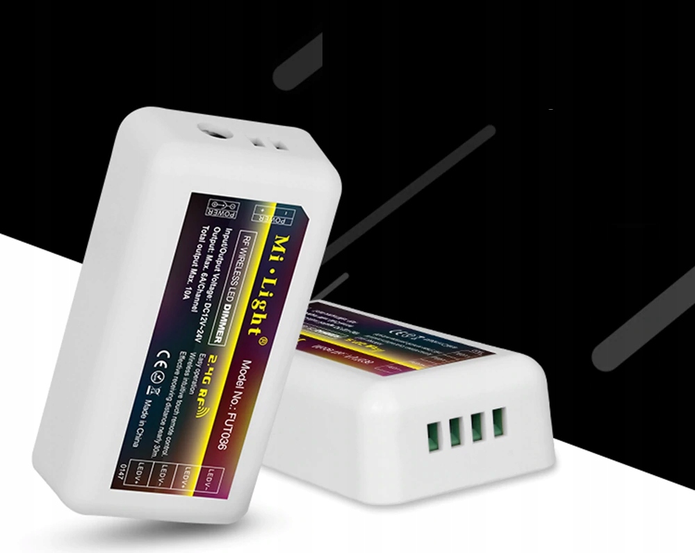 Современный контроллер Mi-Light для одноцветных светодиодных лент, управление которым осуществляется с помощью сенсорного радиопульта или настенной панели. Светодиодным освещением также можно управлять через приложение на телефоне, когда к контроллеру подключен Wi-Fi-мост WL-BOX1.