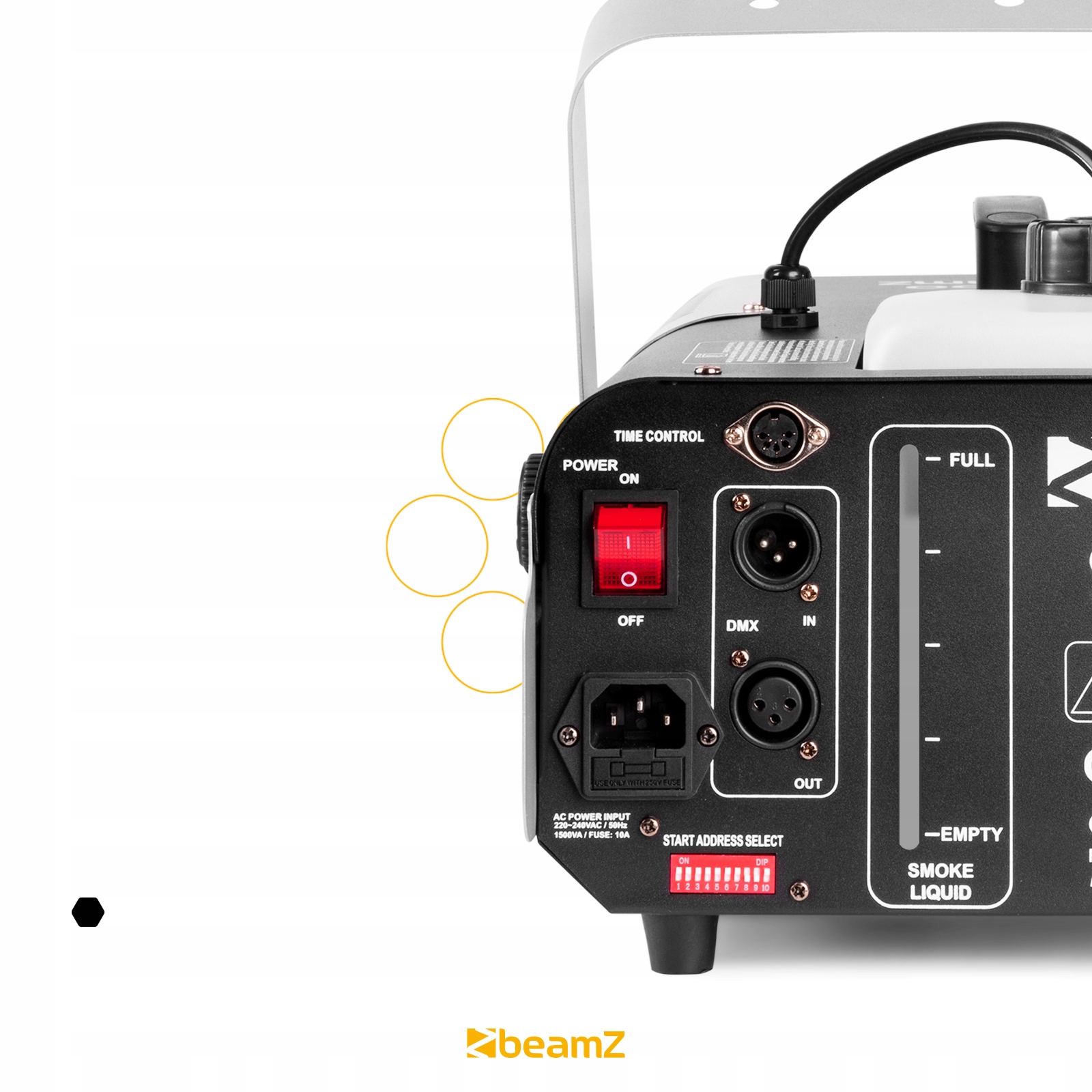 BeamZ S1500 — очень мощная дым-машина мощностью 1500 Вт, которая гарантирует, что любое световое шоу будет выглядеть идеально. Генератор имеет большой резервуар для жидкости, поэтому вам не придется постоянно пополнять его во время вечеринки. Прилагаемый кронштейн позволяет подвешивать машину, например, на ферме. S1500 может управляться по DMX.