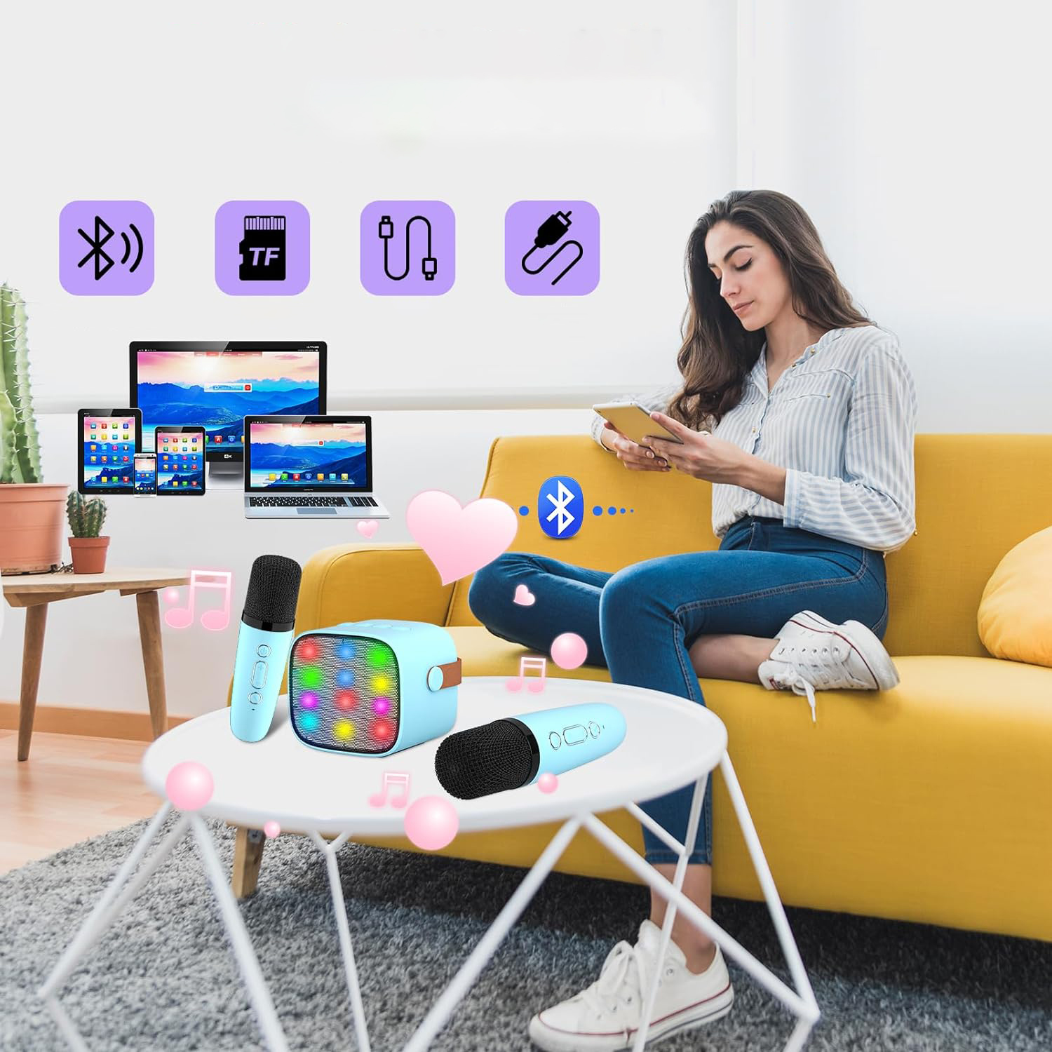 - ☑️- 【Портативная караоке-машина】:Портативная караоке-машина для детей и взрослых, ее размеры 2,95 х 3, 34 х 2,55 дюйма, вес всего 455 г, дети легко поднимают его и берут с собой куда угодно. Высокое качество и мощный звук создают прекрасную атмосферу в прямом эфире КТВ. А динамические светодиодные фонари оживят ваше воспроизведение и идеально подходят для КТВ, вечеринок, встреч и активного отдыха. Поддержка TF-хранилища с песнями в формате MP3, пойте, занимайтесь вокалом, воспроизводите музыку, слушайте песни так, как вам нравится.