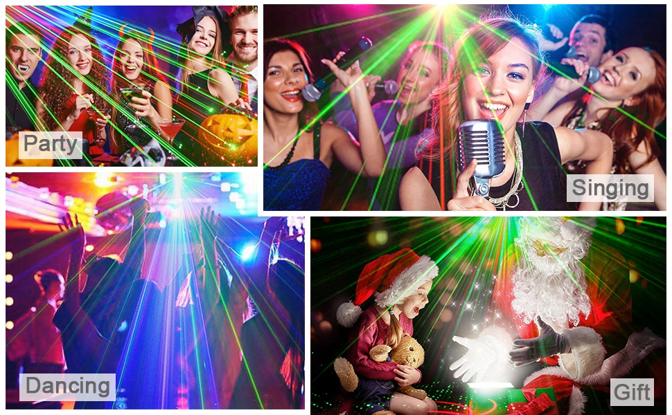 【6 Lens DJ Lights】 — это диско-свет 6 Len DJ, основанный на трех цветах фона: красный/зеленый/красный+зеленый, который может генерировать 30 фантастических комбинаций световых эффектов. Клубное освещение поможет создать приятную сценическую атмосферу и визуальное удовольствие. Эти огни дискотеки для диджеев могут работать 8-10 часов после полной зарядки и отлично подходят в качестве танцевальных огней для вечеринки.