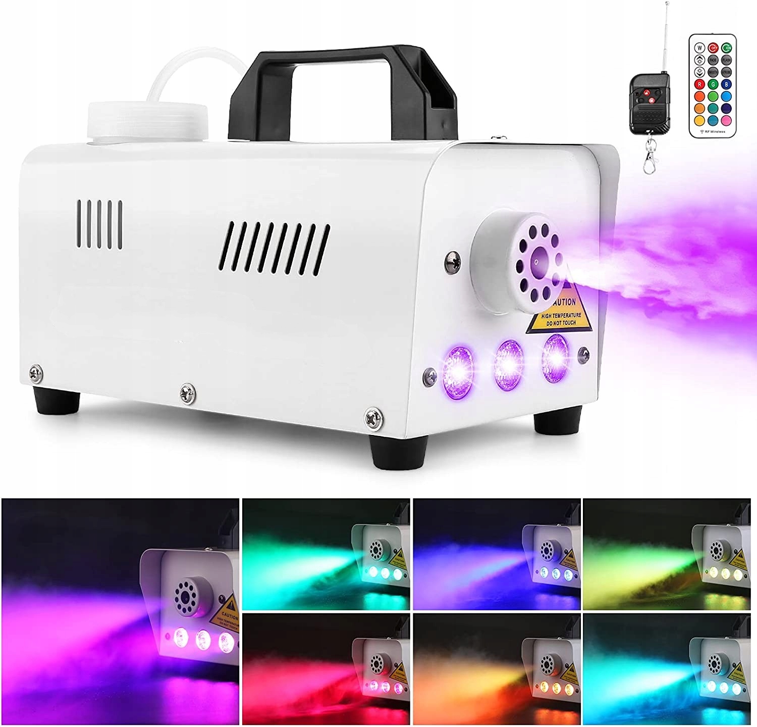 ЭФФЕКТ ЦВЕТНОЙ СВЕТОДИОДНОЙ ПОДСВЕТКИ: Эту машину можно активировать туманом вместе со световым эффектом. Существуют различные светильники, в том числе: красный/синий/зеленый или смешанные цвета, такие как голубой, пурпурный, желтый и белый, а также различные скорости, такие как затухание/вспышка/плавное/стробирование. Производит 2000 кубических футов в минуту нетоксичного тумана на расстоянии 2–3 метров, который длится 30–40 секунд.