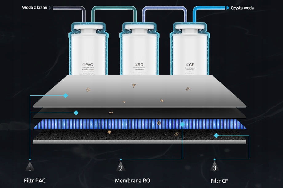 улучшает вкус и удаляет вещества, ответственные за неприятный цвет воды. Рекомендуемая частота замены этого фильтра составляет от 6 до 12 месяцев . Фильтр CF доступен в двух версиях: с параметром минерализации и без