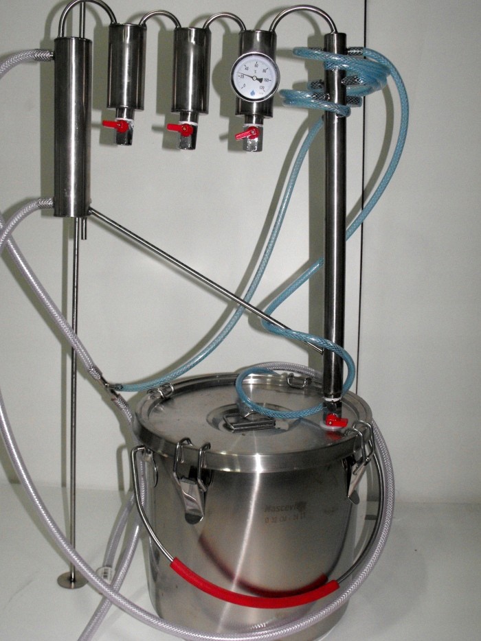 эфирные масла и другие жидкости. Из аппарата не выходят ароматы дистиллированных жидкостей. Благодаря использованию самого большого охладителя в дистиллятах этого типа дистиллят выходит из охладителя полностью охлажденным. Большой кулер существенно повышает эффективность работы.