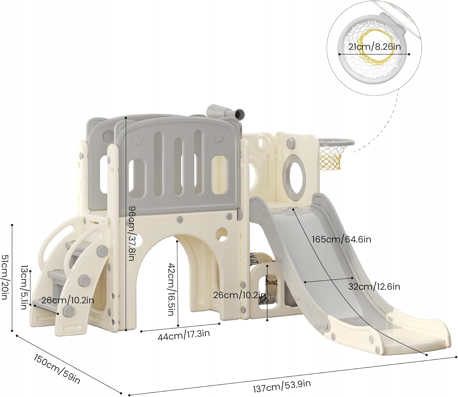 Вашему ребенку понравится этот красочный слайд со стеной для скалолазания, баскетболом и туннелем! Этот многофункциональный набор из прочного пластикового HDPE обеспечивает безопасное удовольствие дома или на открытом воздухе. Благодаря широкой зоне посадки, повышенным барьерам и гладкой поверхности, она идеально подходит для малышей в возрасте до 1-6 лет . Развивает координацию, баланс и творчество, согласно методу Монтессори.