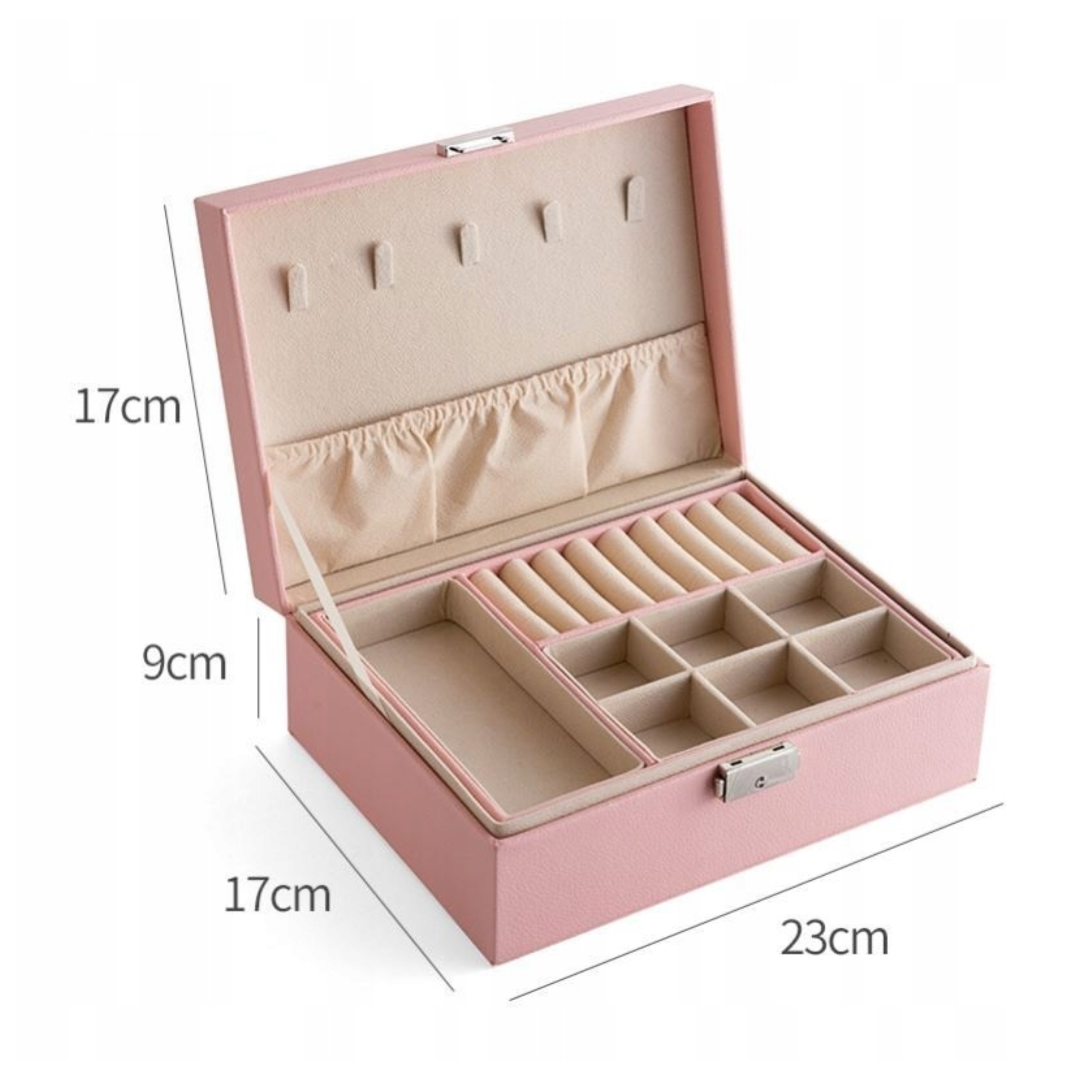 Коробка для ювелирных изделий состоит из 2 слоев, которые достаточно велики, чтобы вместить все аксессуары. С различными отсеками для размещения серьгов, колец и часов , а также практических попаданий по суспендированию ожерелья или браслета для предотвращения запутывания или связывания