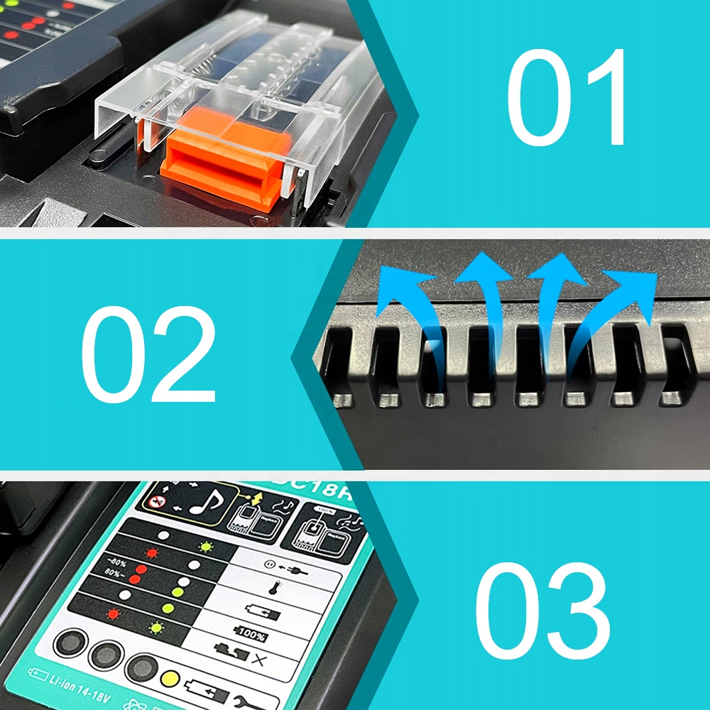 - , совместимая с 14,4 В/18 В для зарядки батарей Makita Lithium-Ion (кроме 10,8 В). Схема предотвращает перегрев батареи, короткую зарядку, долгосрочную зарядку и обнаружение дефектной батареи.