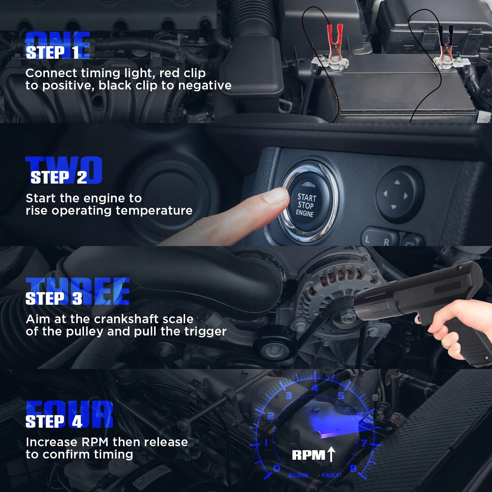 - Индикатор времени зажигания: предназначен для изменения времени зажигания автомобиля, чтобы получить наилучшую возможную производительность. Подходит для автомобилей, мотоциклов, лодков, всех двух ударов и четырехдушных бензиновых двигателей, он легко работает на системах зажигания 12 В. Высокое качество делает его не очень удобным. Струйный индукционный зажим обеспечивает легкое и безопасное соединение. Вместимость для обнаружения системы управления автомобилем и системы управления углом вакансии изменяется с изменением скорости. Индукционный зажим для кабеля высокого напряжения затягивается на линии высокого напряжения цилиндра, а стрелка на индукционном зажиме указывает направление свечи Spark для нормальной работы