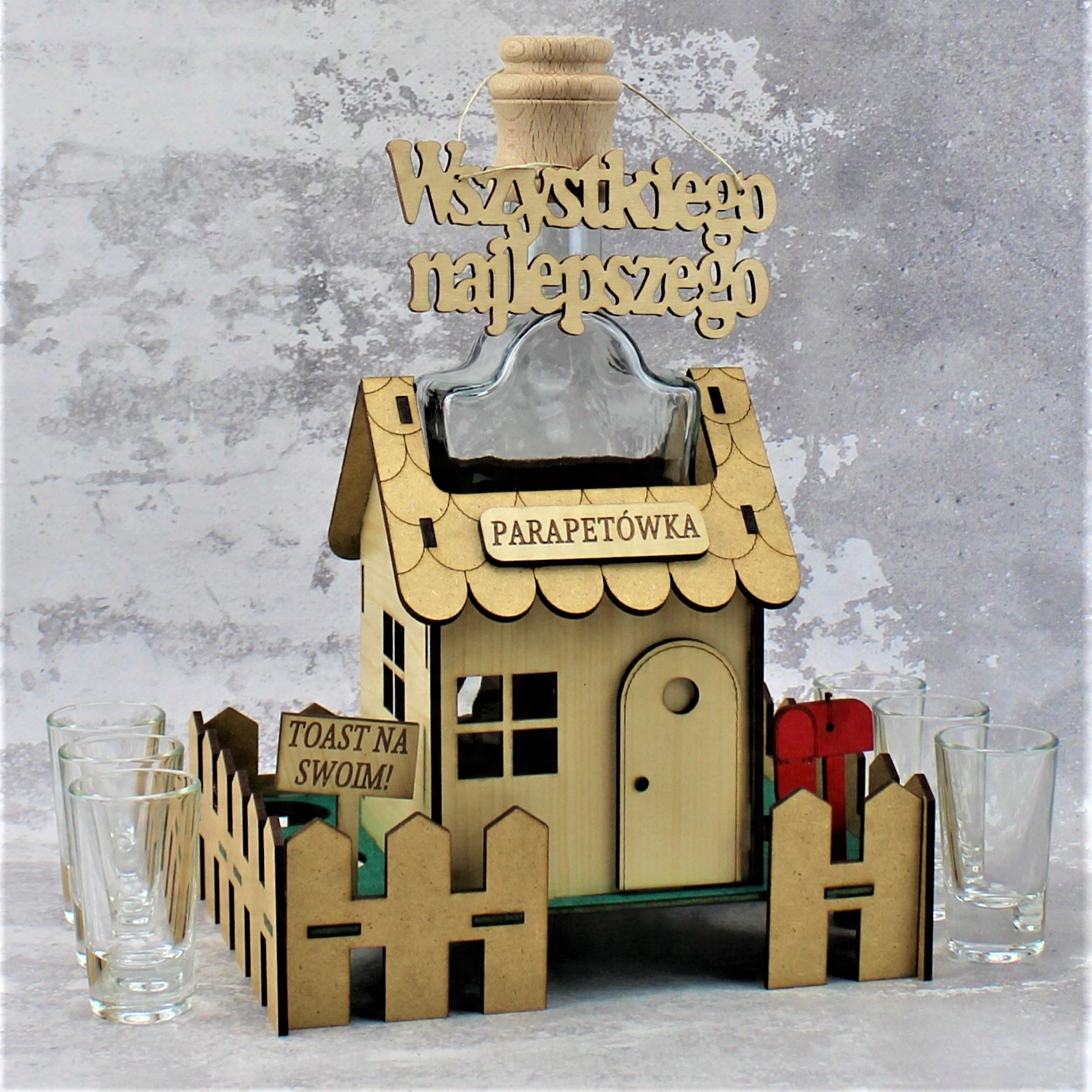 Предлагаем Вам отличный подарок по этому случаю - графин для алкоголя со стаканами, поставленный на подставку в виде домика с садом.