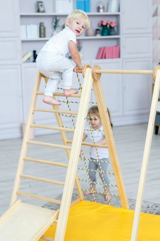 Home -Like Zebra Playground для детей -многофункциональная пирамида, которая может быстро выдержать любимую детскую площадку вашего ребенка. Набор подходит как современный интерьер и сад. Повернув пирамиду, вы откроете ряд дополнительных возможностей для игры. Пирамида может быть быстро складывается и хранится где угодно. Функциональность набора зебры заключается в том, что каждая страница позволяет выполнять новые упражнения. Деревянная лестница, подъемная струнная сетка, гимнастика, палка - это только начало интересного веселья. Кроме того, набор оснащен гимнастическими аксессуарами, которые могут быть скорректированы к индивидуальным потребностям каждого ребенка. Малыш любит качать или подниматься на линию, как в роще Обезьяны - все это можно найти в выбранных вариантах набора зебры.