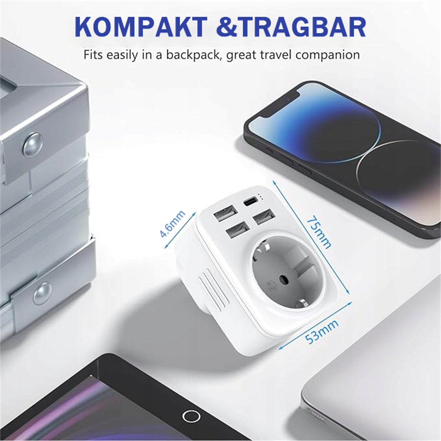 - Маленький размер, легкий и компактный, не занимает слишком много места, дизайн 5 в 1 (3 порта USB-A, 1 порт USB Type-C, 1 слот переменного тока), многофункциональный и практичный, подходит для использования во время путешествий.