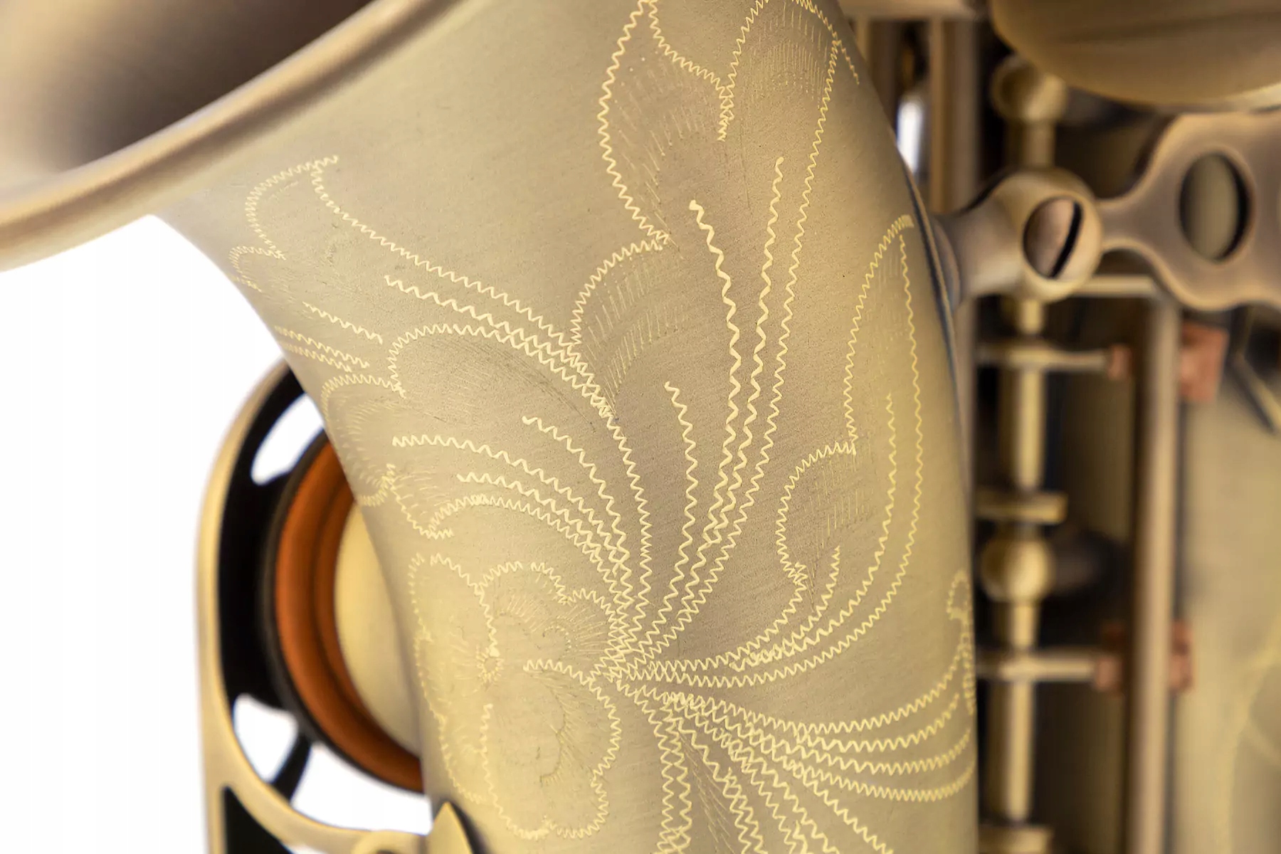 Матовая патина придает нашим саксофонам чрезвычайно аутентичный вид. Посмотрите, как будто они рассказывают историю давних музыкальных традиций. Эта тщательно обработанная патина придает им благородство и неповторимый характер, делая их уникальными среди других инструментов.