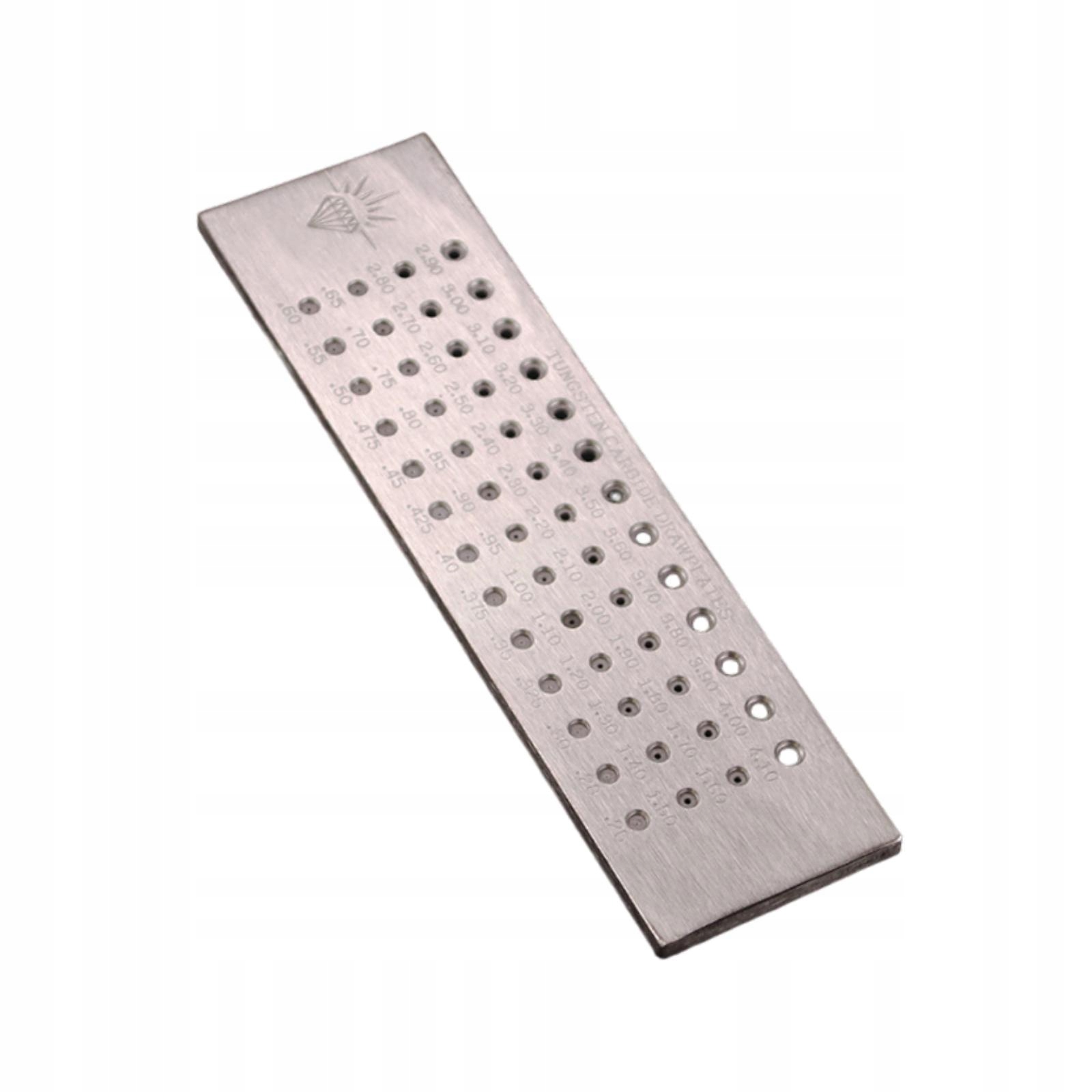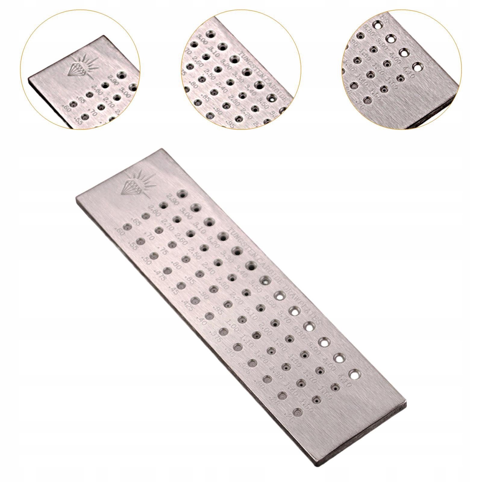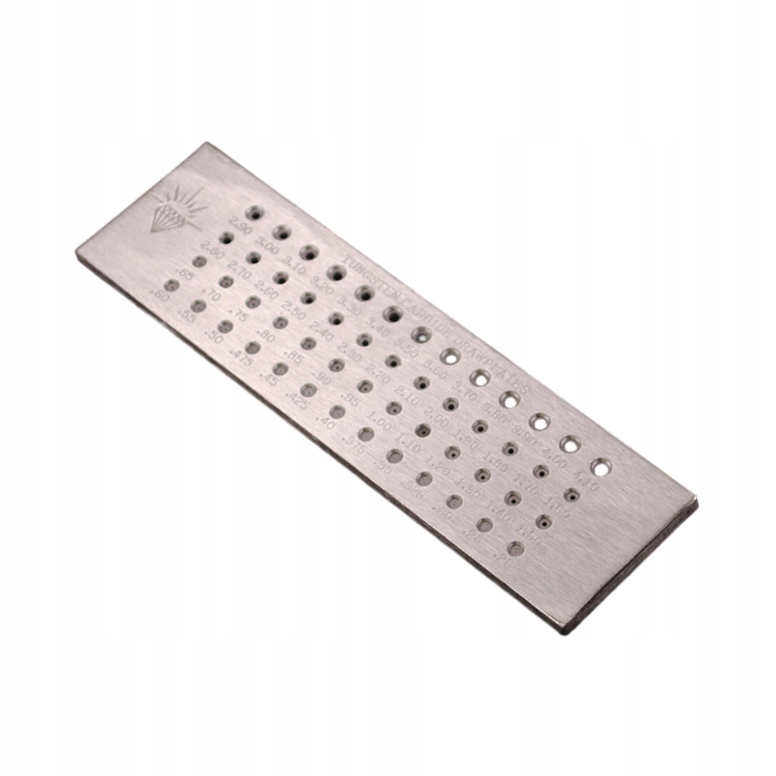 [Размеры]: рисование имеет размеры 20,5 см x 5,5 см/8,07 дюйма x 2.17 дюймов. [Спецификация проволочных отверстий]: Пластина Draw имеет круглые отверстия диаметром от 0,26 мм до 4,1 мм, 52 круглых отверстия, содержащие различные размеры проводов для различных ювелирных конструкций