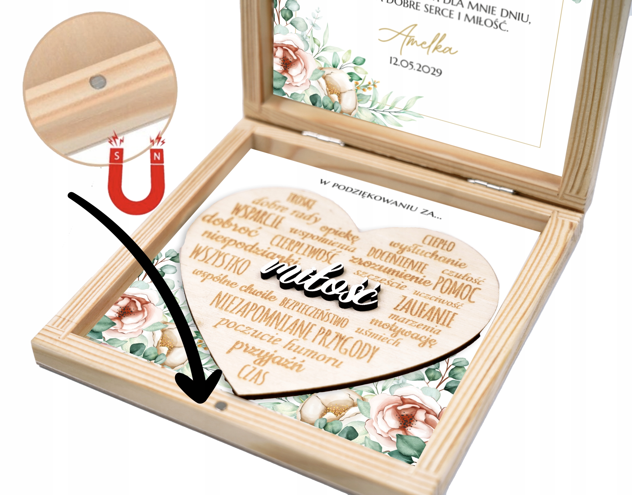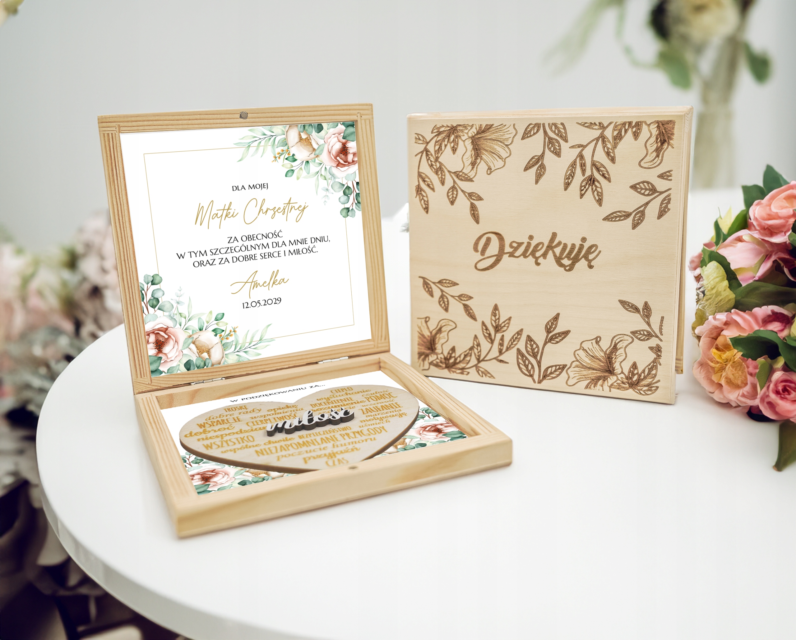 Красивый подарок-спасибо для крестных или бабушек и дедушек в деревянной коробке. Внутри коробки находится персонализированная благодарственная записка с именем и датой, а также уникальное деревянное сердце с 3D-эффектом с выгравированными словами, за которые ребенок благодарит своего крестного или дедушку или бабушку. Отличная идея выразить благодарность за ваше присутствие и заботу. Такой подарок удивит получателей и отблагодарит их за участие в этом неповторимом празднике! ❤️