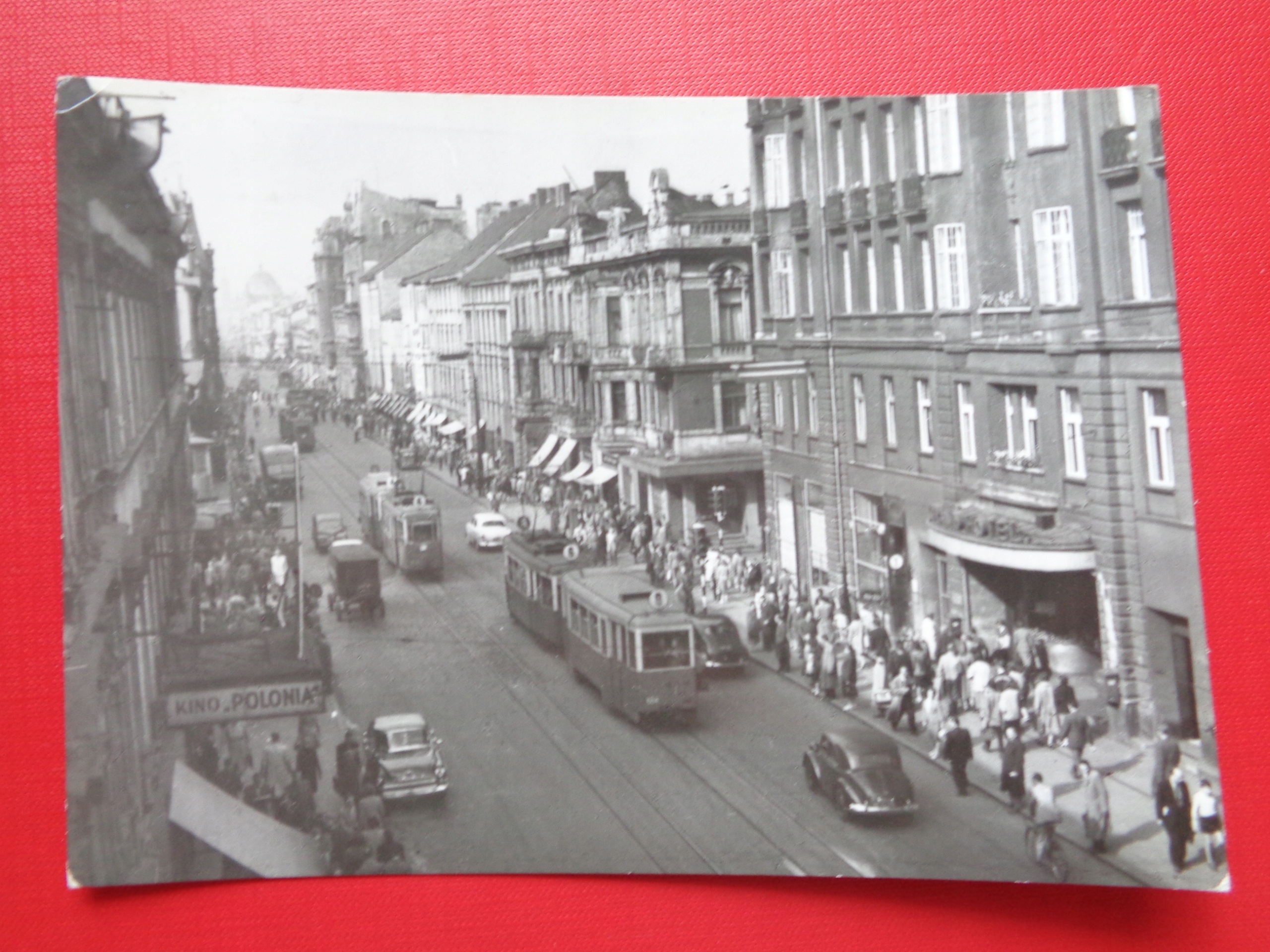 ŁÓDZ -ULICA PIOTRKOWSKA -TRAMWAJE ,FURMANKA, SAMOCHODY 1962r