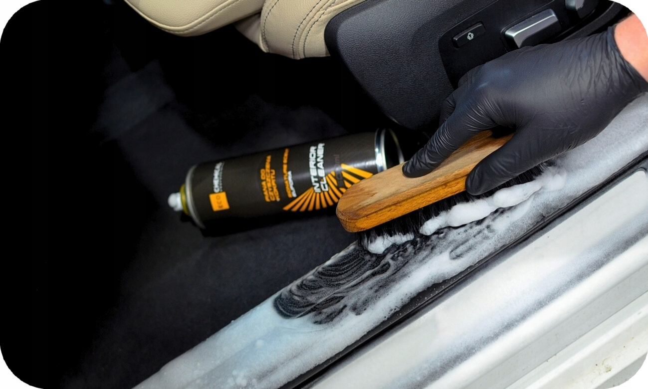 - Встряхните с помощью банки, нанесите подготовку к ткани из микрофибры или щеткой и очистите поверхность круглыми движениями. Затем протрите высохую чистым микрофибром.