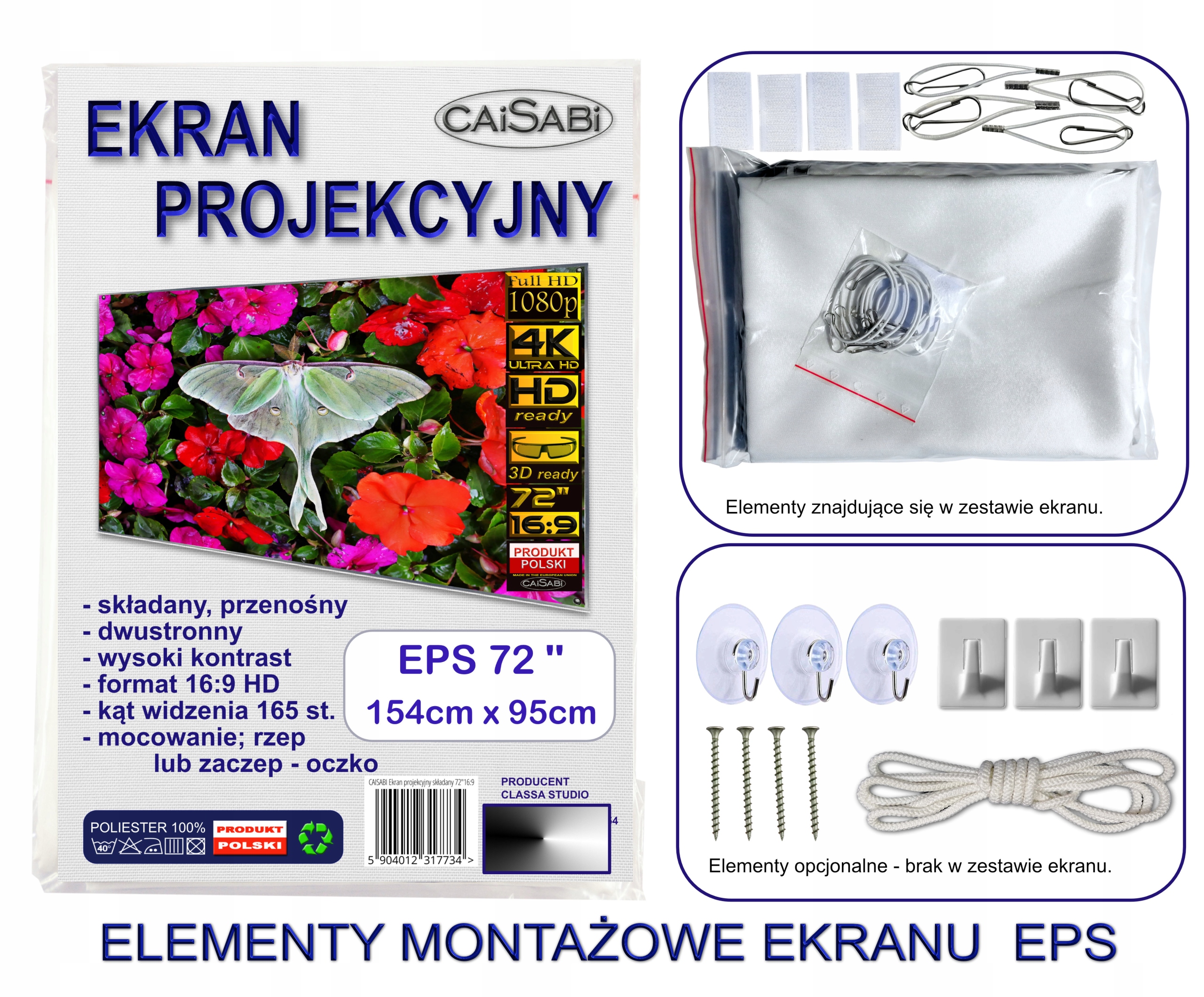 Экран производится в Польше из высококачественной полиэфирной ткани. Верхний слой экрана был покрыт устойчивым к пятнам вещества, обеспечивающего высокий контраст, яркость и угол зрения. Мы предлагаем шесть размеров такого типа экрана; 125 дюймов, 105 дюймов, 102 дюйма, 75 дюймов, 72 дюйма и 62 дюйма. На этом аукционе экран имеет диагональ 72 дюйма (размер изображения 154 см х 95 см).