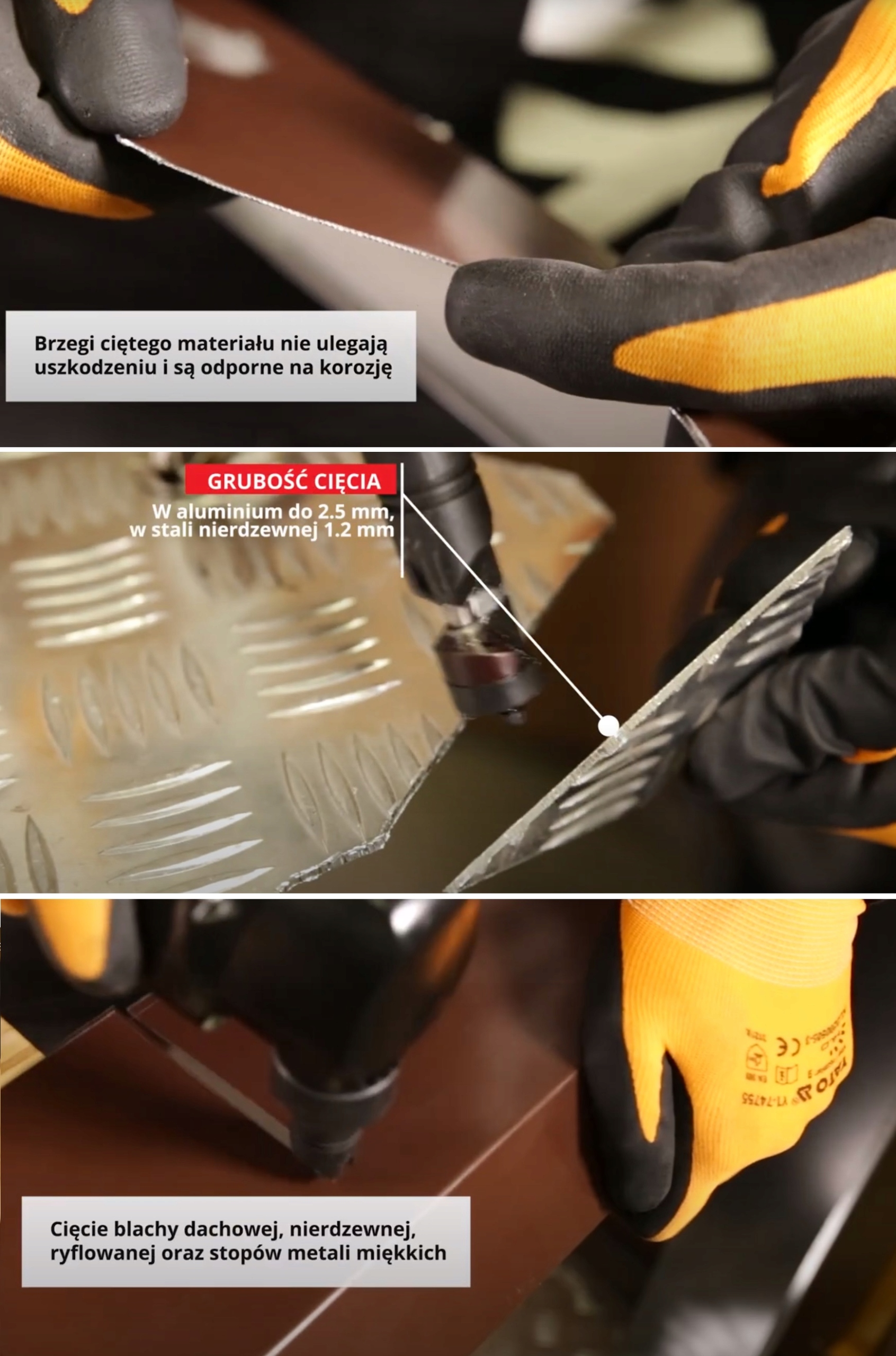 Конструкция ножниц позволяет резать трапециевидный листовой металл, а также вырезать прямые и круговые линии, а также в труднообрабатываемых материалах. достигать таких мест, как распределительные центры, системы кондиционирования и вентиляции или электрические распределительные щиты.