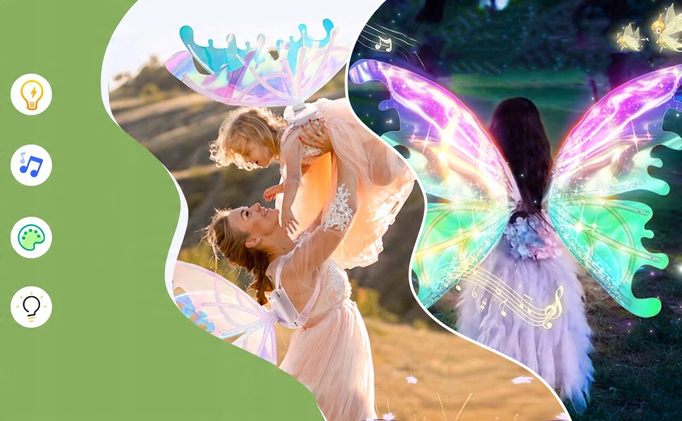 - Изменить в волшебное существо благодаря электрическим крыльям сказочной, украшенной красивыми светодиодными светодиодными лампами и съемными крыльями матерей, которые будут легко трепетать. День рождения, Хэллоуин или Рождество.