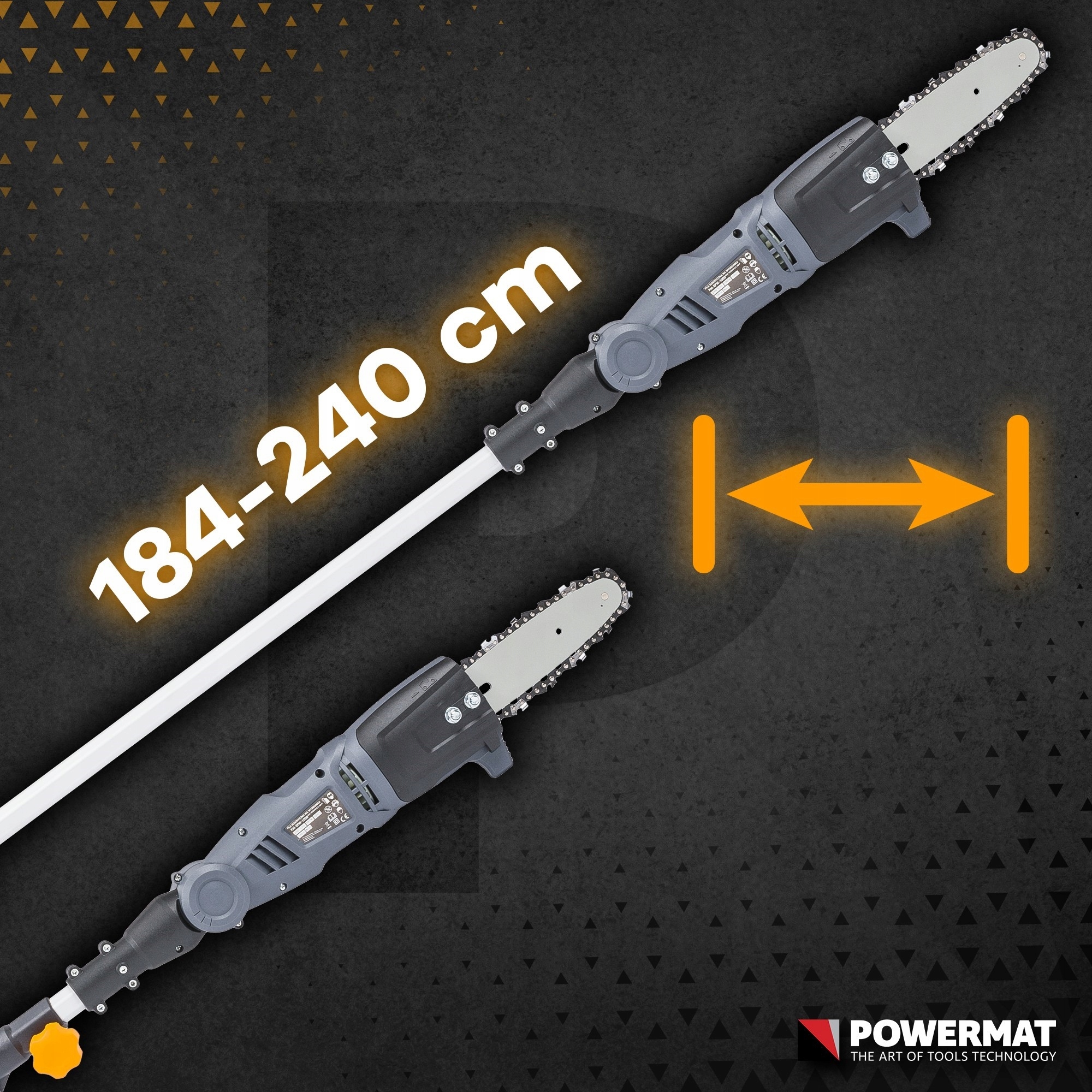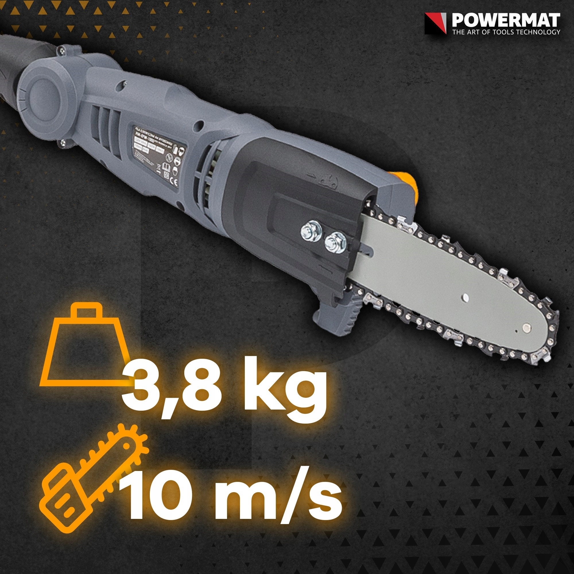 Электрическая пила на бум с тремя постепенными корректировками наклона компании Powermat PM-EPW-1000 с высококачественным руководством и цепью. Возможность быстрой и легкой регулировки длины стрелы в диапазоне от 184 см до 240 см. Электродвигатель 1000 Вт позволяет вырезать толстые ветви благодаря источнику питания.