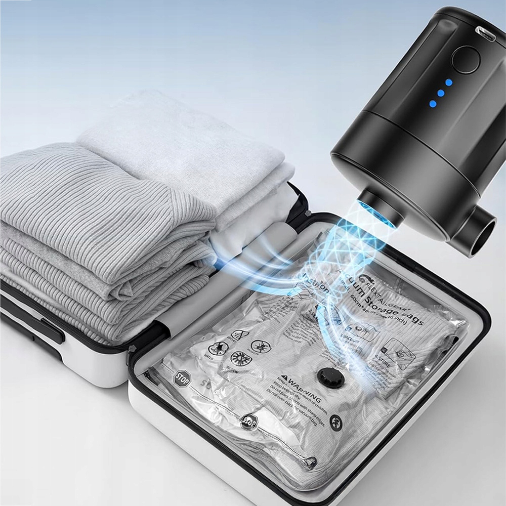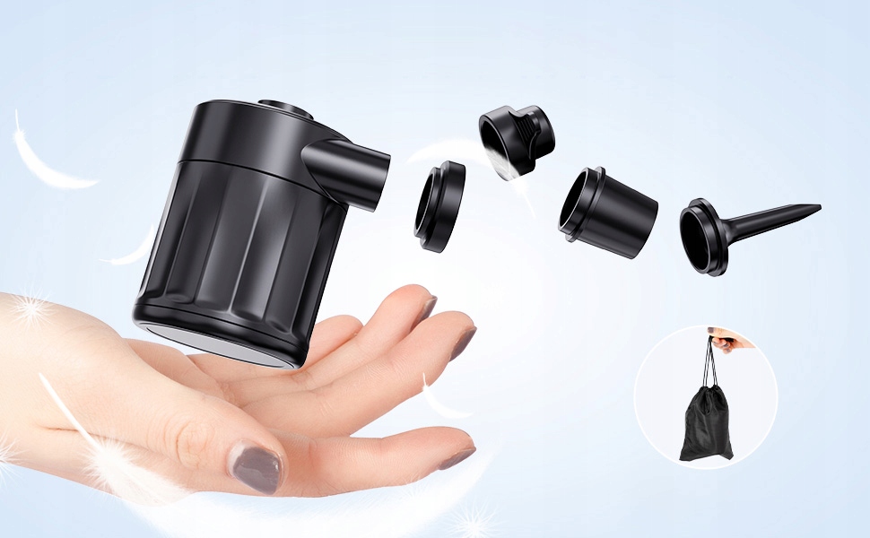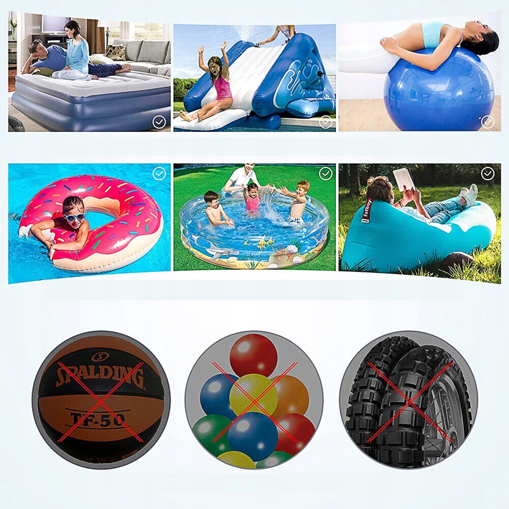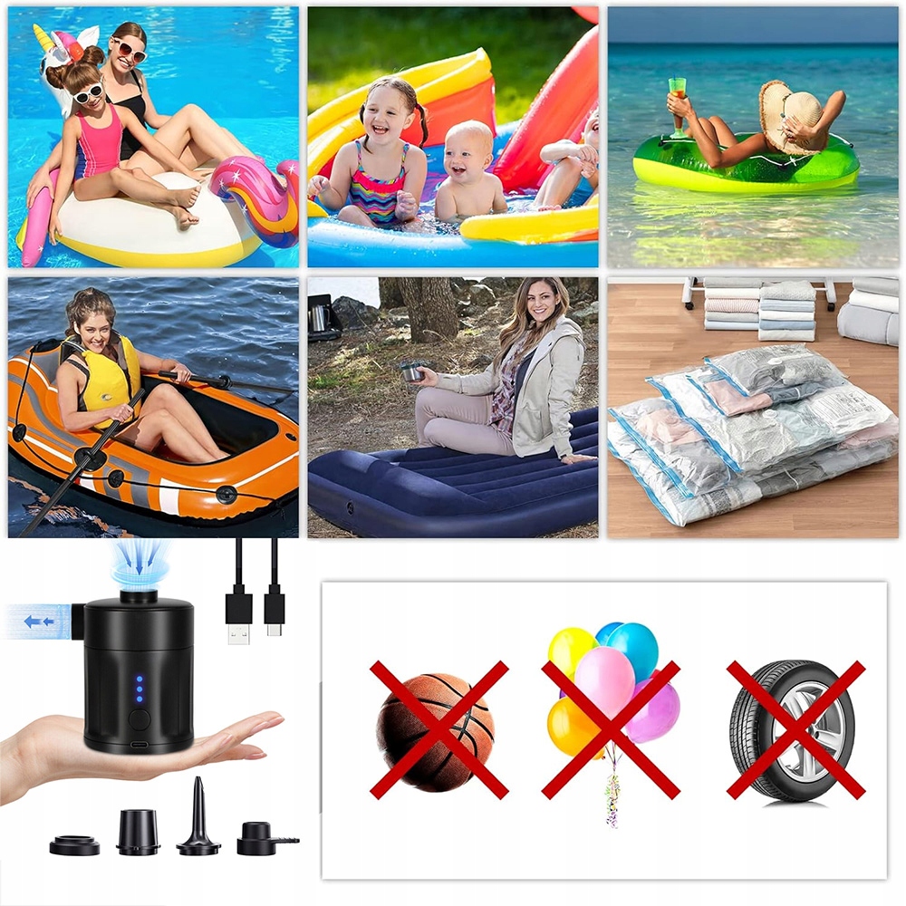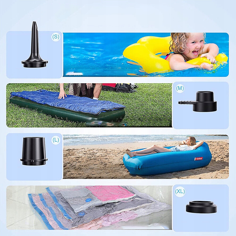 Электрический воздушный насос оснащен 4 различным сопла для большинства мелких и крупных надувных продуктов, таких как надувные бассейны, плавающие колеса, воздушные матрасы, матрасы, кайс и другие надувные предметы, которые могут удовлетворить ваши потребности, связанные с надуванием. Кроме того, электрический воздушный насос также может быть использован для пылесоса мешков для хранения и высасывает весь избыток воздуха из вакуумного пакета без необходимости купить дополнительную вакуумную машину