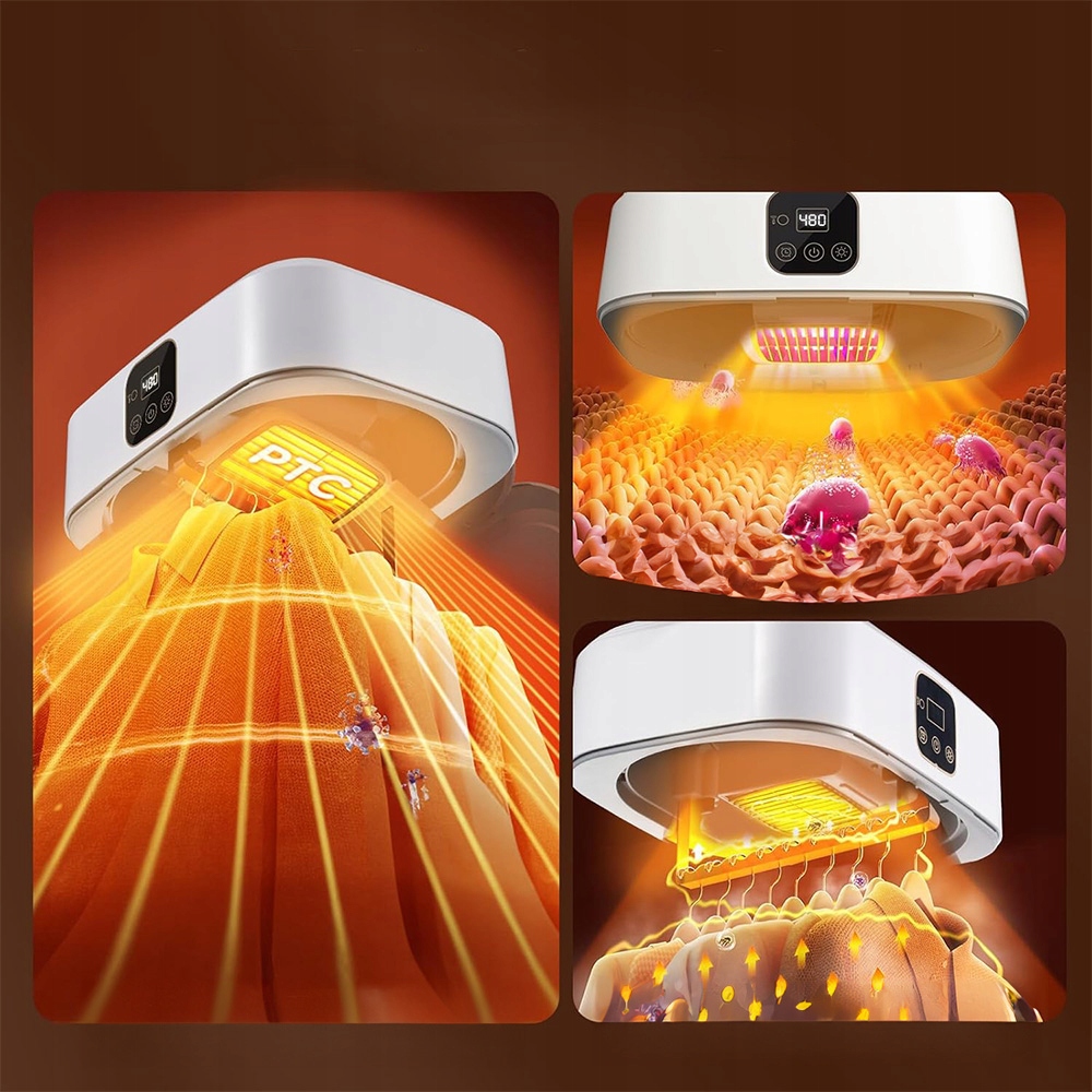 ♨- Есть 2 режима на выбор, режим 1- это нормальная сушка, обеспечивающая теплый воздух 40-50 °, подходящий для шелка, шерсти и т. Д.; Режим 2- быстрая и сильная сушка, обеспечивая горячий воздух 50-60 °, подходящий для хлопка, льна, нейлона, полиэстера и т. Д. Имитирует солнечный свет и эффективно удаляет клещей.