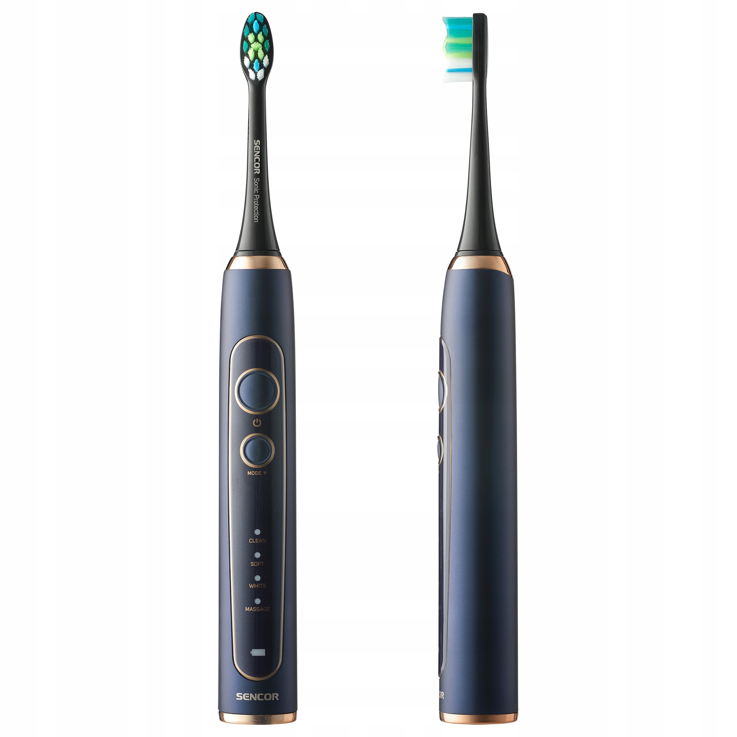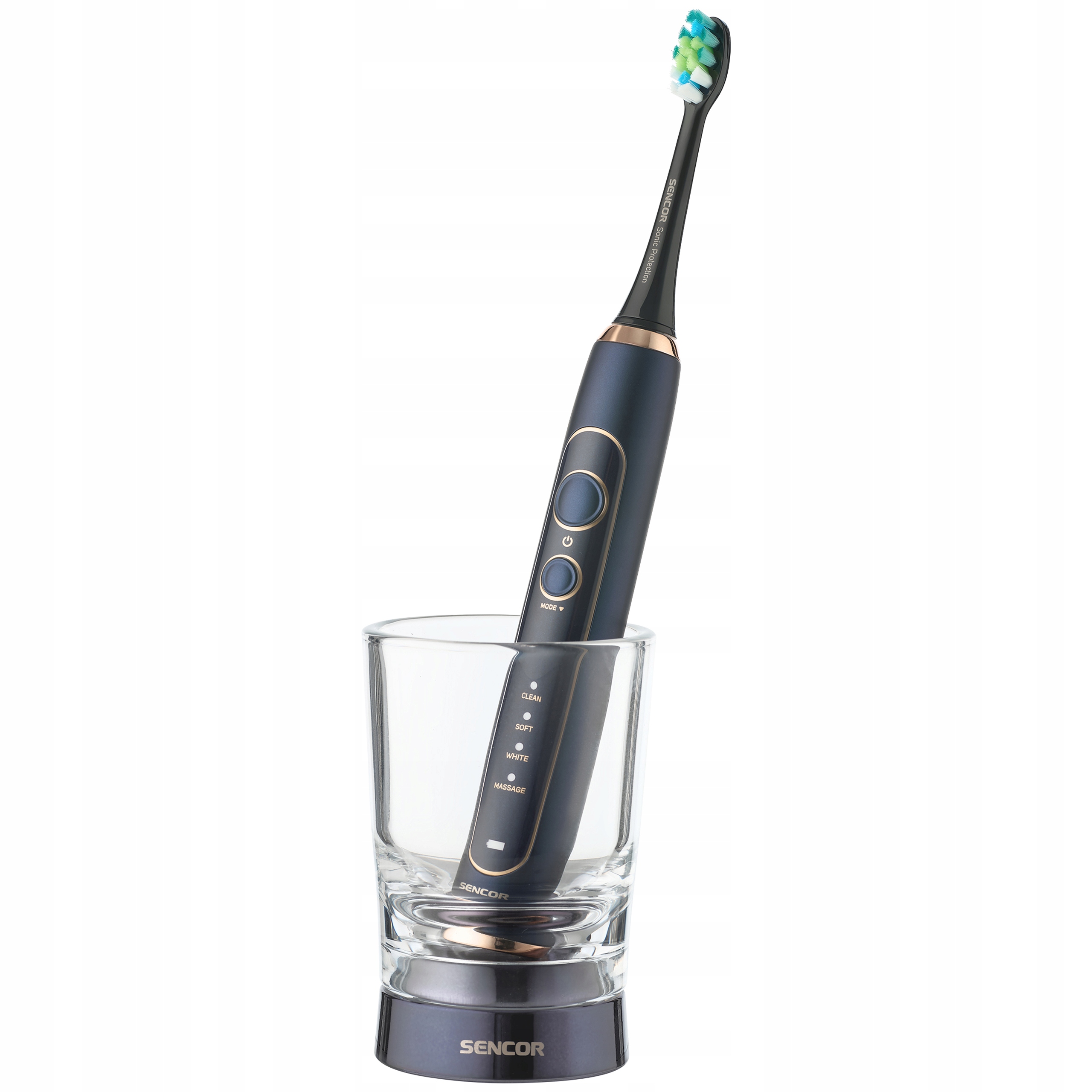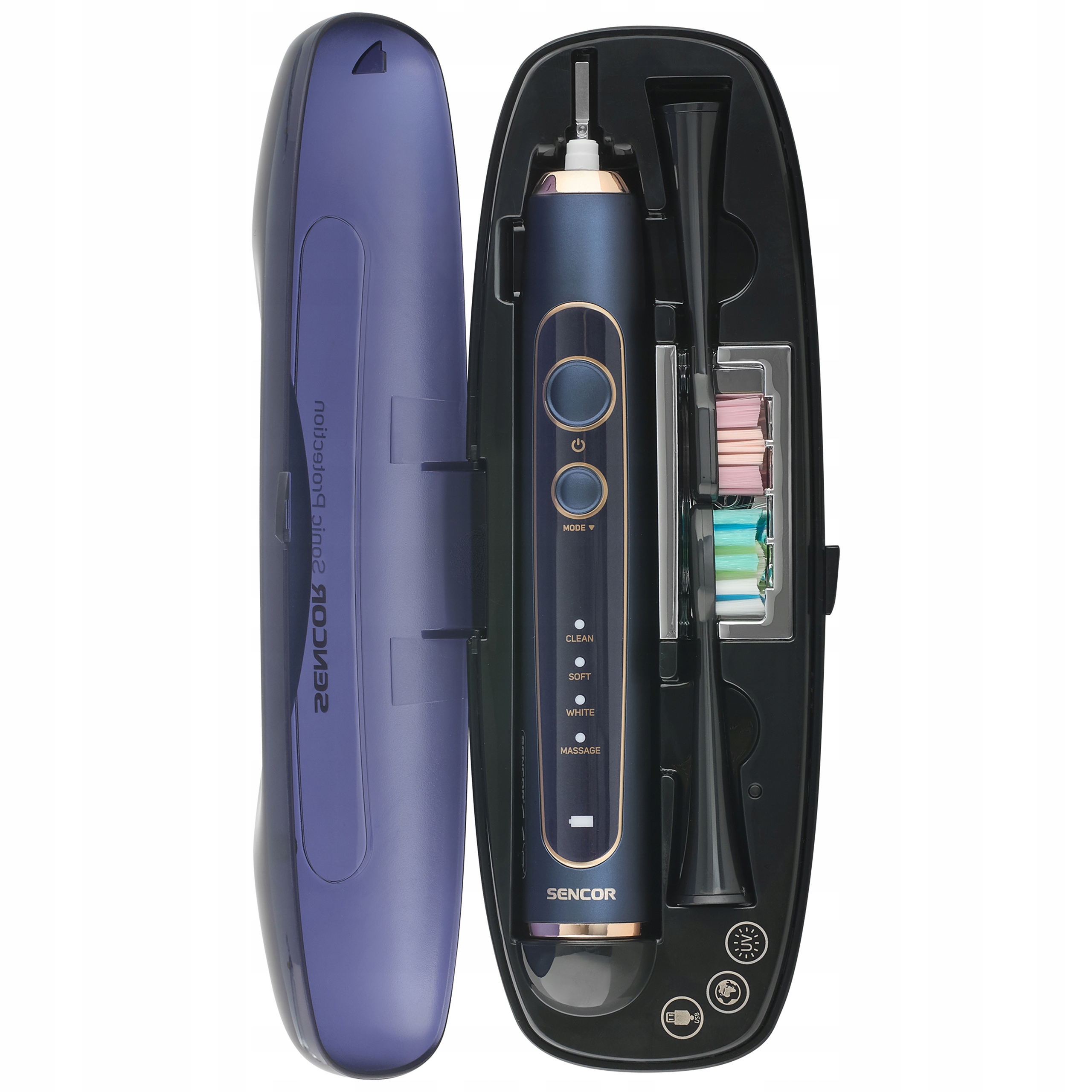 В дополнение к синей ручке Sencor, я добавляю стекло с функцией беспроводной зарядки. Также будет 2 запасных совета, соответствующих корпусу кисти. Набор включает в себя аксессуар, такой как крышка гигиенической щетины на голове, и защитный чехол, в котором вы можете положить всю кисть.