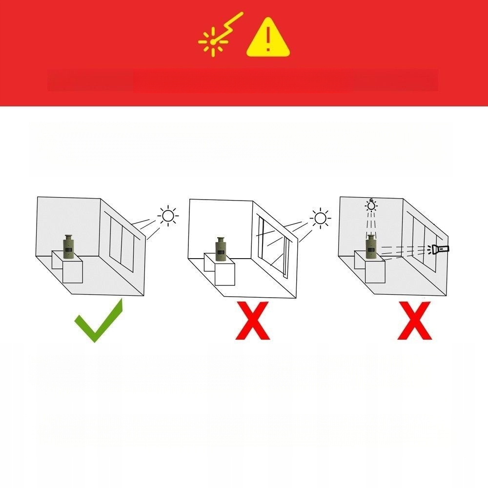 Этот лазерный дараст предназначен для использования в помещении. Это может не работать должным образом в условиях сильного освещения. Следовательно, его не следует использовать снаружи или размещать вблизи окон или места с сильным освещением.